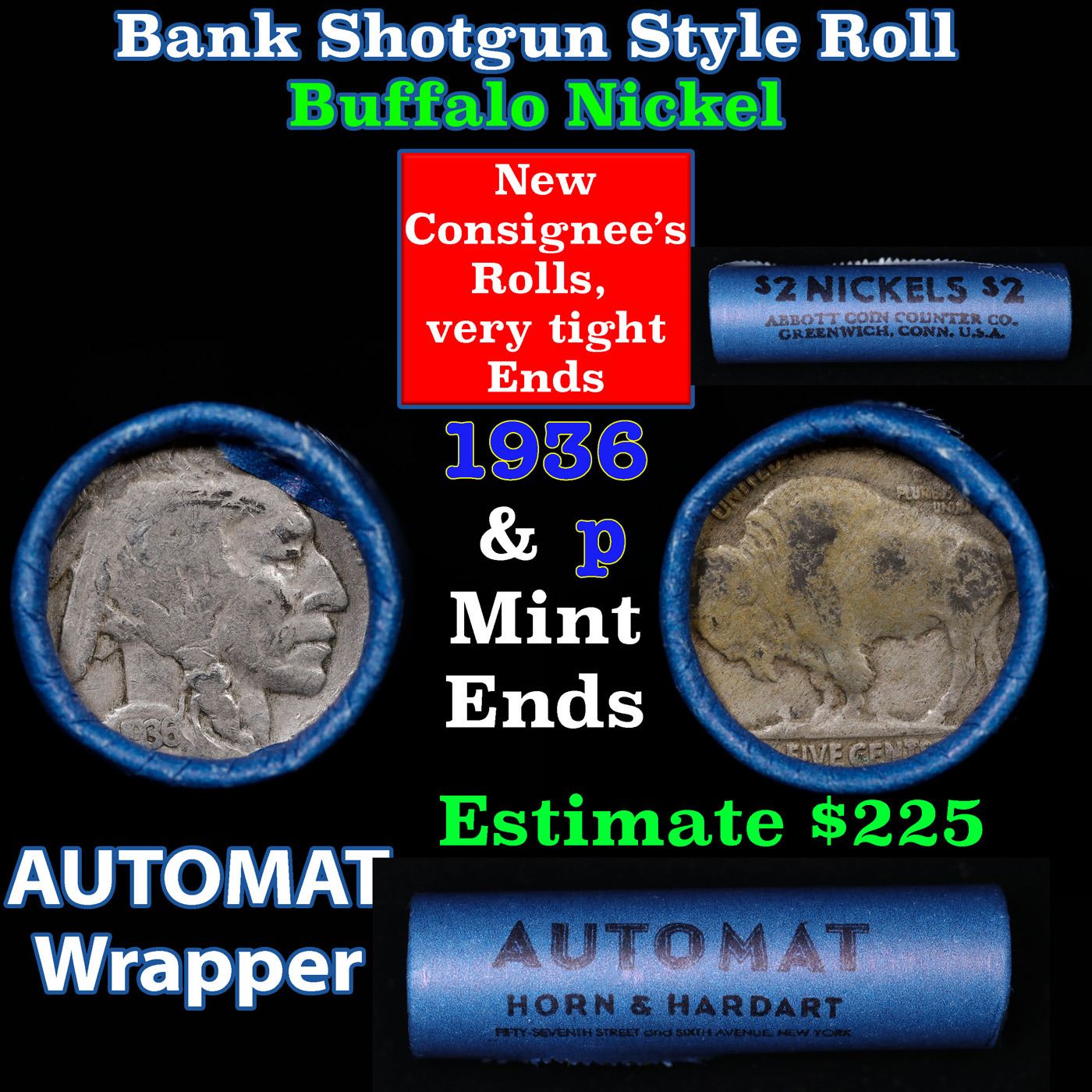 Buffalo Nickel Shotgun Roll in Old Bank Style 'Abbott Coin Counter & Automat' Wrapper 1936 & p Mint Ends. The roll is held in an old, rare "Bell Telephone Co." Bank style wrapper. This is the Bell Telephone logo from the 1960's. They are all frrom one Estate. The ends on these rolls are very tight. We will guarantee they are all full dates.