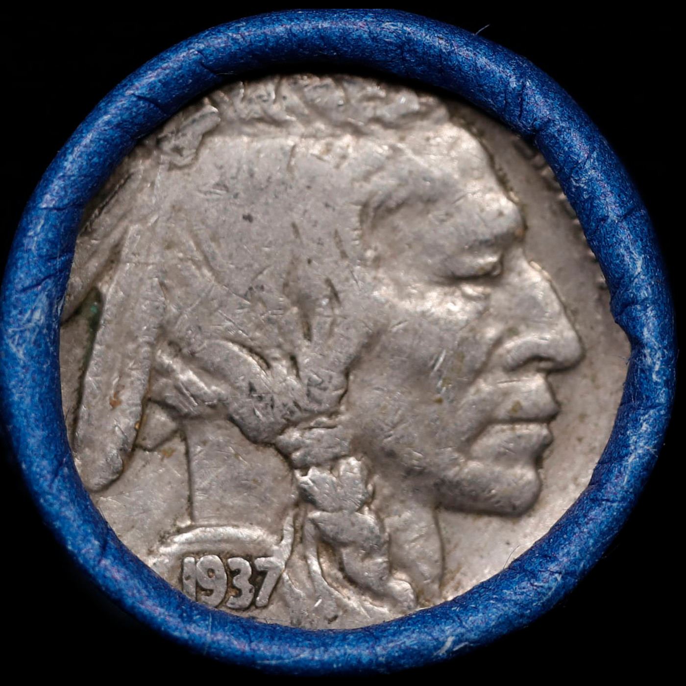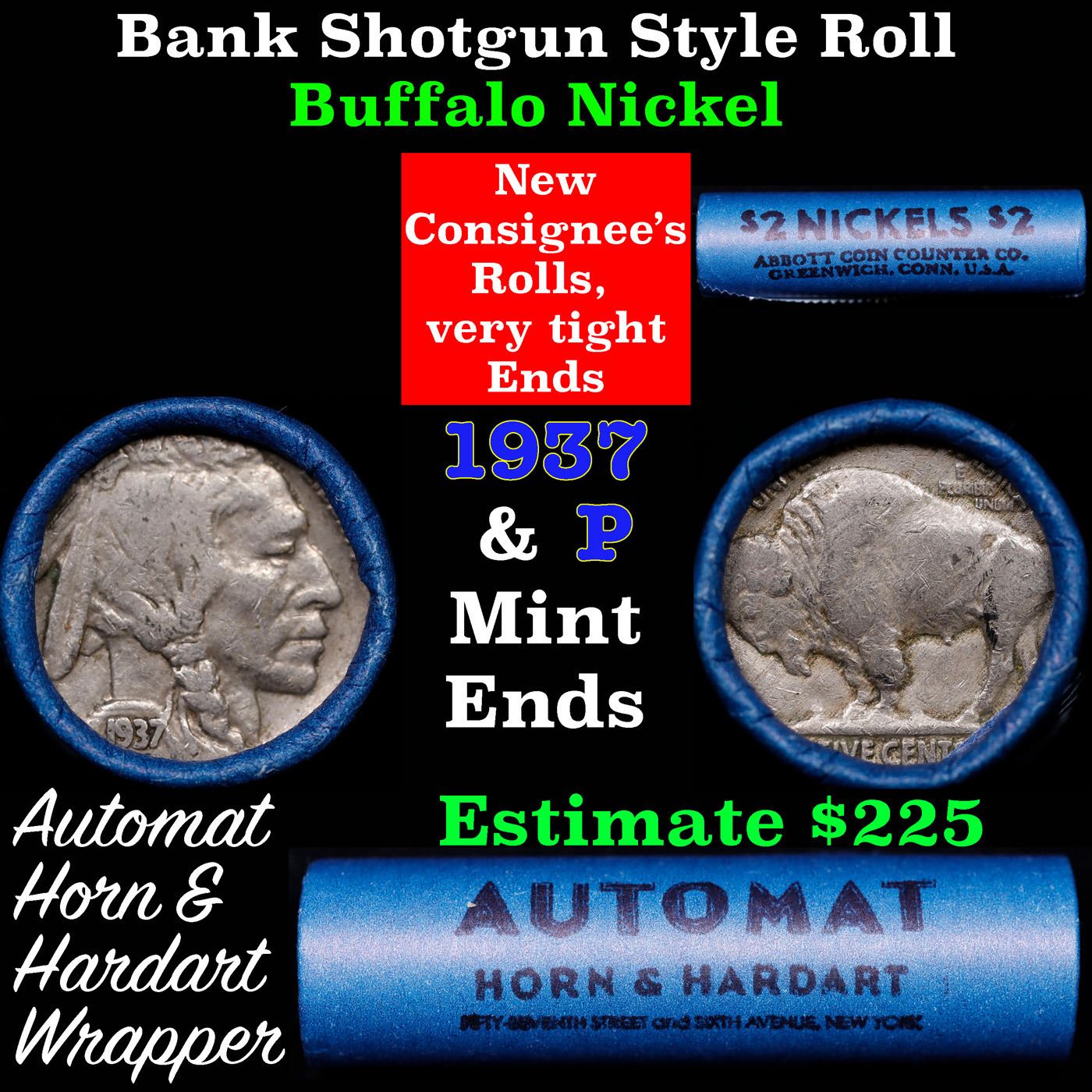 Buffalo Nickel Shotgun Roll in Old Bank Style 'Abbott Coin Counter & Automat' Wrapper 1937 & p Mint Ends. The roll is held in an old, rare "Brandt Abbott Coin Counter" Bank style wrapper. They are all from one estate, the ends on these rolls are very tight. We will guarantee they are all full dates.
