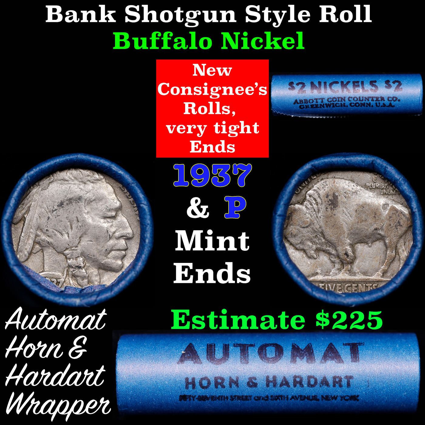 Buffalo Nickel Shotgun Roll in Old Bank Style 'Abbott Coin Counter & Automat' Wrapper 1937 & p Mint Ends. The roll is held in an old, rare "Brandt Abbott Coin Counter" Bank style wrapper. They are all from one estate, the ends on these rolls are very tight. We will guarantee they are all full dates.