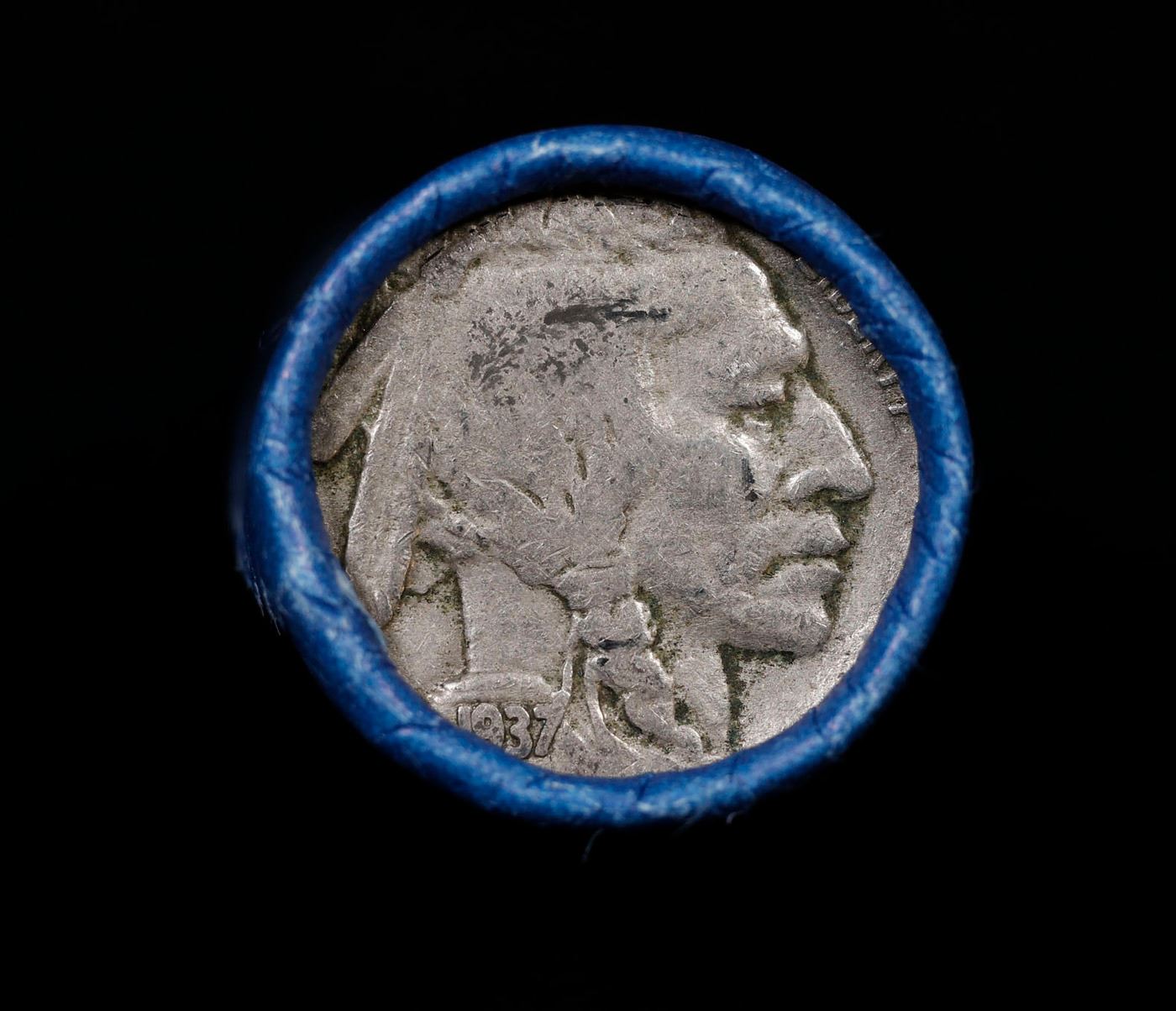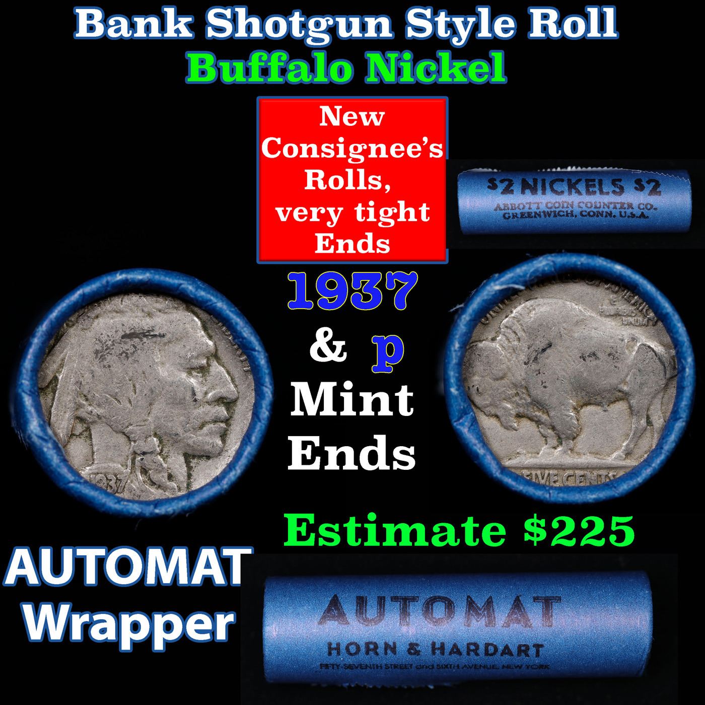 Buffalo Nickel Shotgun Roll in Old Bank Style 'Abbott Coin Counter & Automat' Wrapper 1937 & p Mint Ends. The roll is held in an old, rare "Bell Telephone Co." Bank style wrapper. This is the Bell Telephone logo from the 1960's. They are all frrom one Estate. The ends on these rolls are very tight. We will guarantee they are all full dates.
