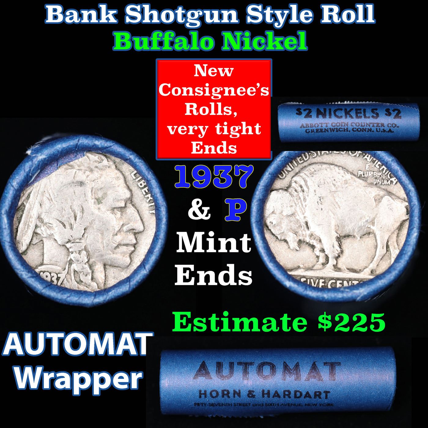 Buffalo Nickel Shotgun Roll in Old Bank Style 'Abbott Coin Counter & Automat' Wrapper 1937 & p Mint Ends. The roll is held in an old, rare "Bell Telephone Co." Bank style wrapper. This is the Bell Telephone logo from the 1960's. They are all frrom one Estate. The ends on these rolls are very tight. We will guarantee they are all full dates.