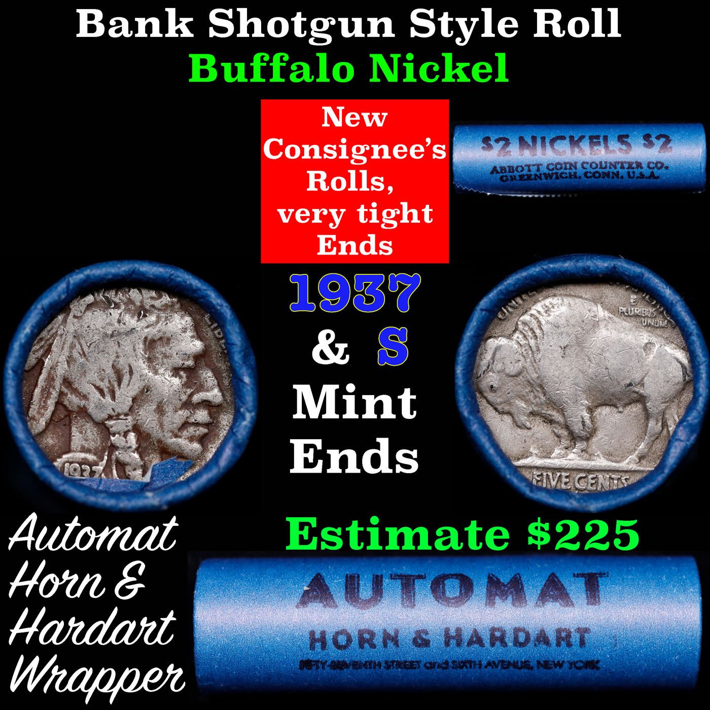 Buffalo Nickel Shotgun Roll in Old Bank Style 'Abbott Coin Counter & Automat' Wrapper 1937 & s Mint Ends. The roll is held in an old, rare "Brandt Abbott Coin Counter" Bank style wrapper. They are all from one estate, the ends on these rolls are very tight. We will guarantee they are all full dates.