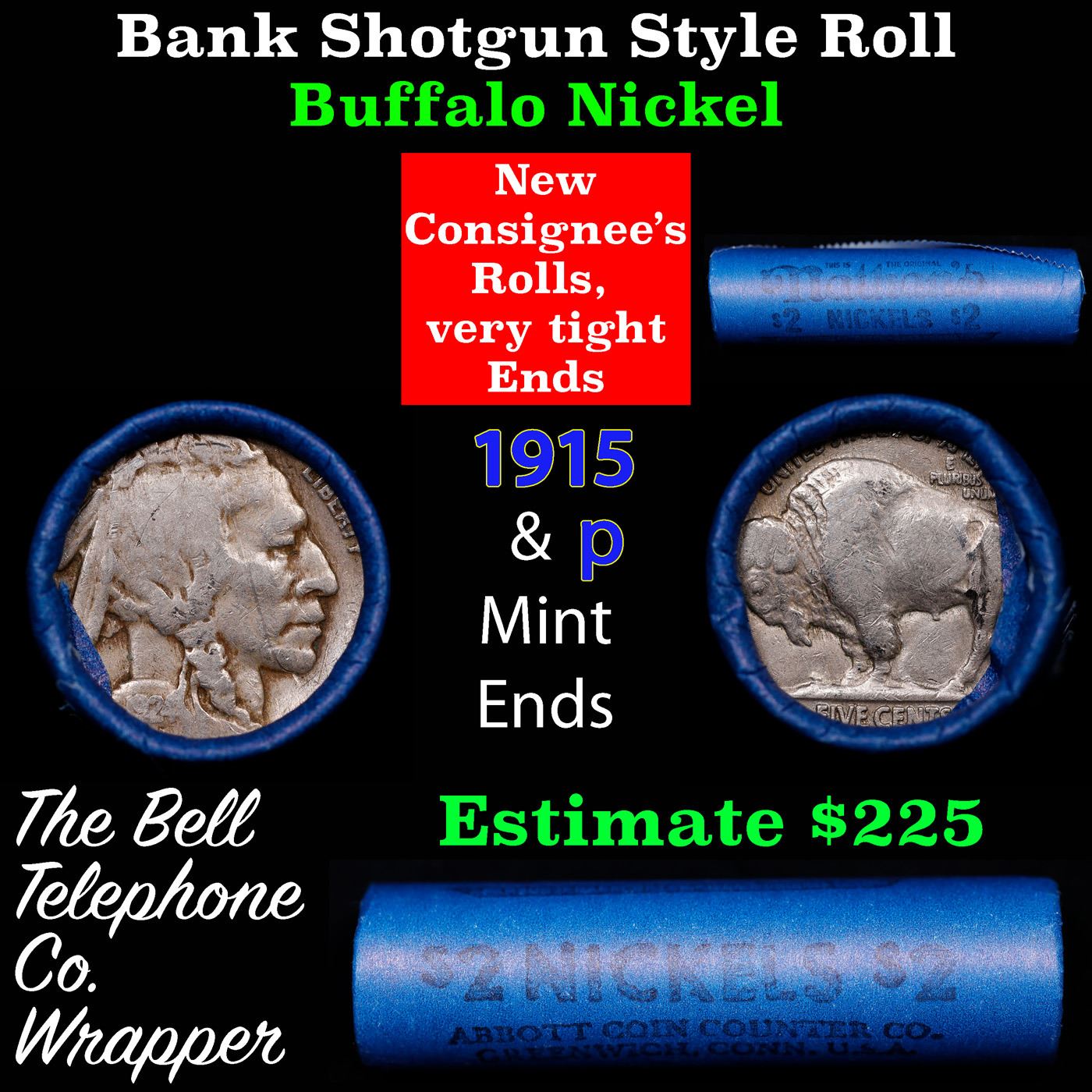 Buffalo Nickel Shotgun Roll in Old Bank Style 'Abbott Coin Counter' Wrapper 1924 & p Mint Ends. The roll is held in an old, rare "Brandt Abbott Coin Counter" Bank style wrapper. They are all from one estate, the ends on these rolls are very tight. We will guarantee they are all full dates.