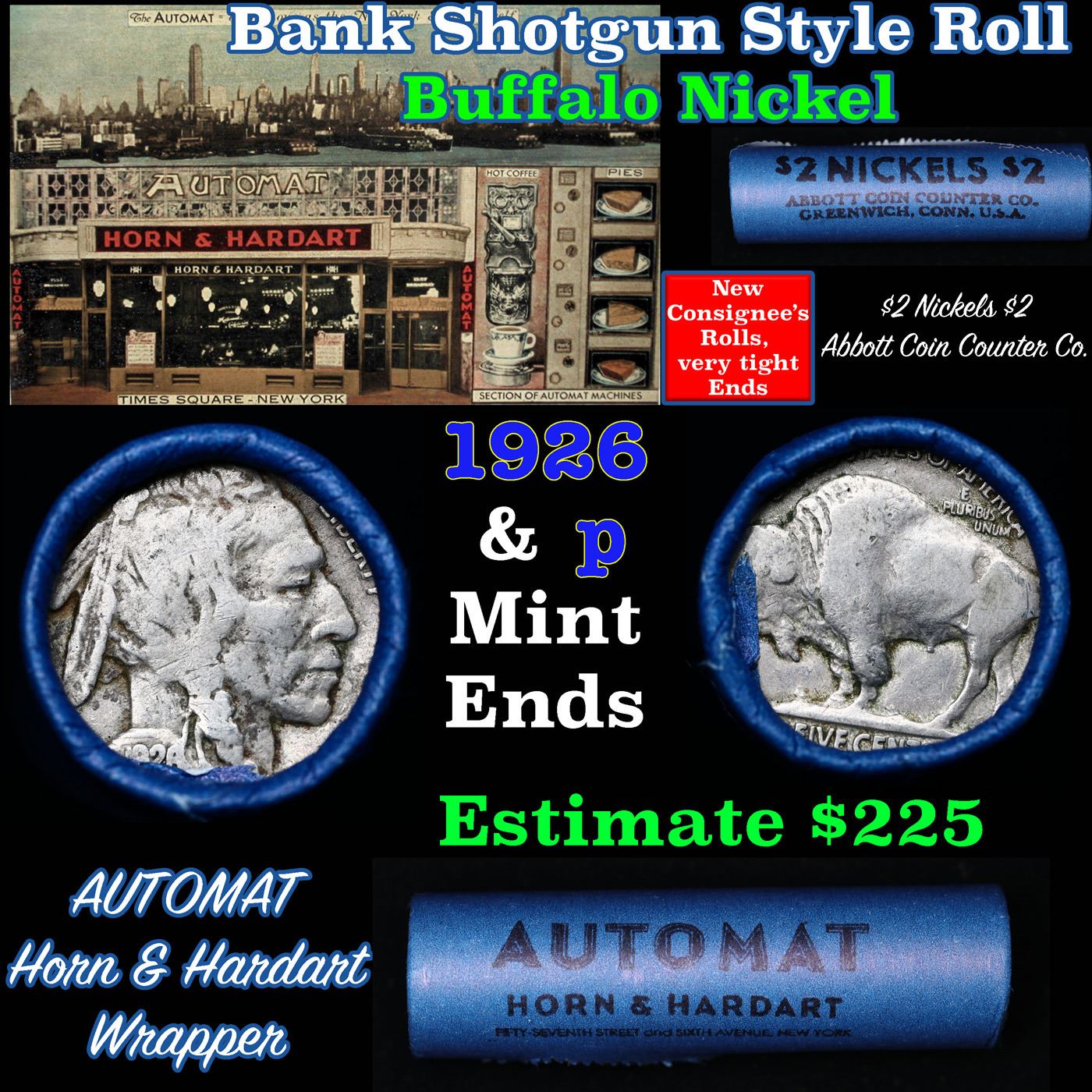 Buffalo Nickel Shotgun Roll in Old Bank Style ' Abbott Coin Counter' Wrapper 1926 & p Mint Ends. The roll is held in an old, rare "Brandt Abbott Coin Counter" Bank style wrapper. They are all from one estate, the ends on these rolls are very tight. We will guarantee they are all full dates.
