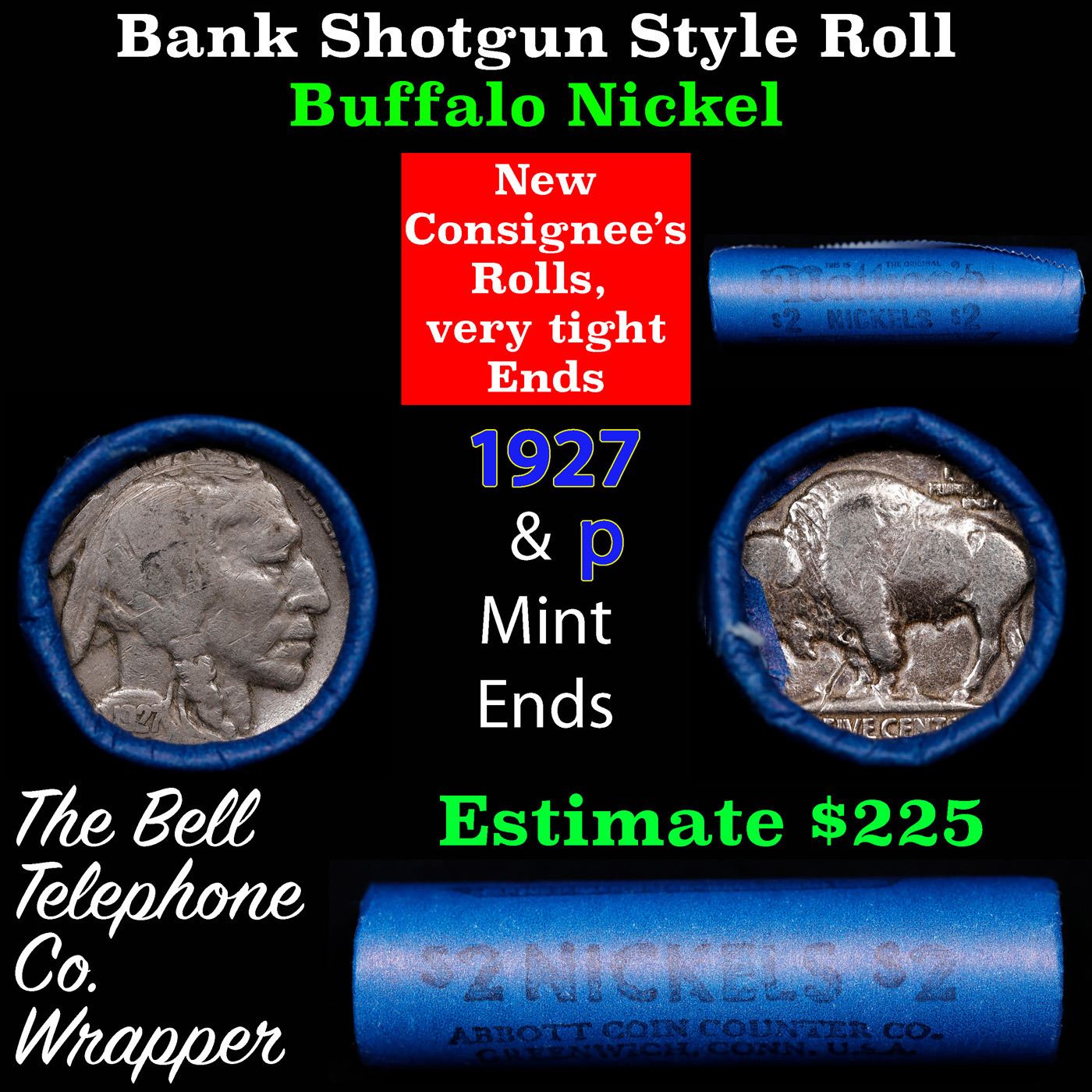 Buffalo Nickel Shotgun Roll in Old Bank Style 'Abbott Coin Counter' Wrapper 1927 & p Mint Ends. The roll is held in an old, rare "Brandt Abbott Coin Counter" Bank style wrapper. They are all from one estate, the ends on these rolls are very tight. We will guarantee they are all full dates.