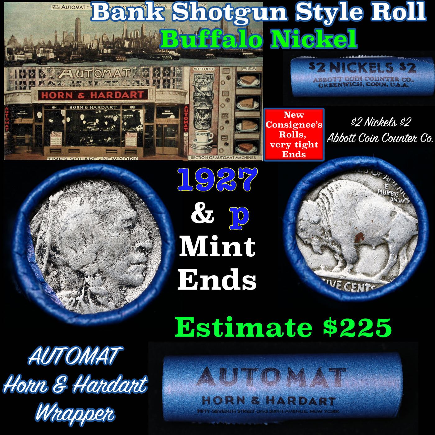 Buffalo Nickel Shotgun Roll in Old Bank Style ' Abbott Coin Counter' Wrapper 1927 & p Mint Ends. The roll is held in an old, rare "Brandt Abbott Coin Counter" Bank style wrapper. They are all from one estate, the ends on these rolls are very tight. We will guarantee they are all full dates.