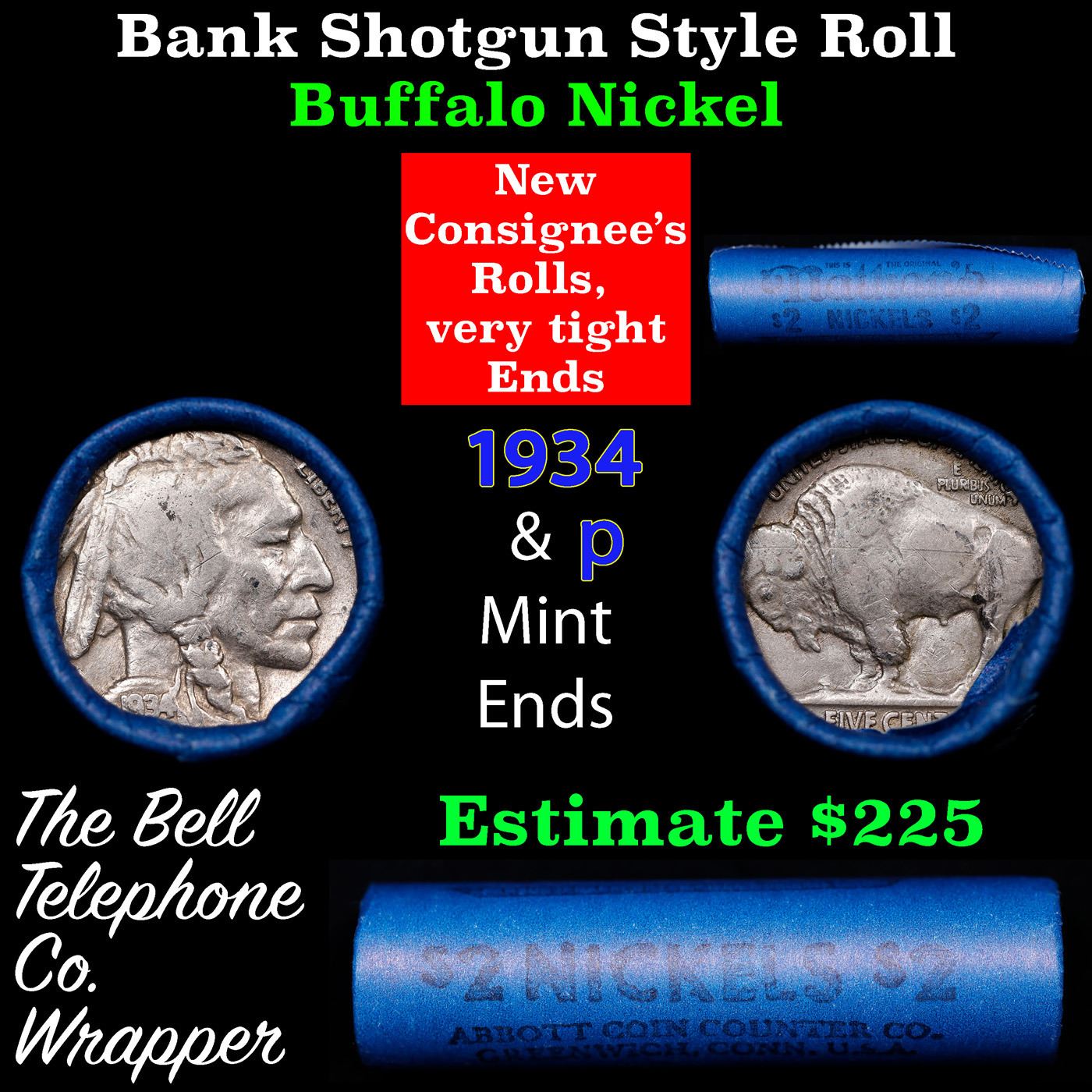 Buffalo Nickel Shotgun Roll in Old Bank Style 'Abbott Coin Counter' Wrapper 1934 & p Mint Ends. The roll is held in an old, rare "Brandt Abbott Coin Counter" Bank style wrapper. They are all from one estate, the ends on these rolls are very tight. We will guarantee they are all full dates.