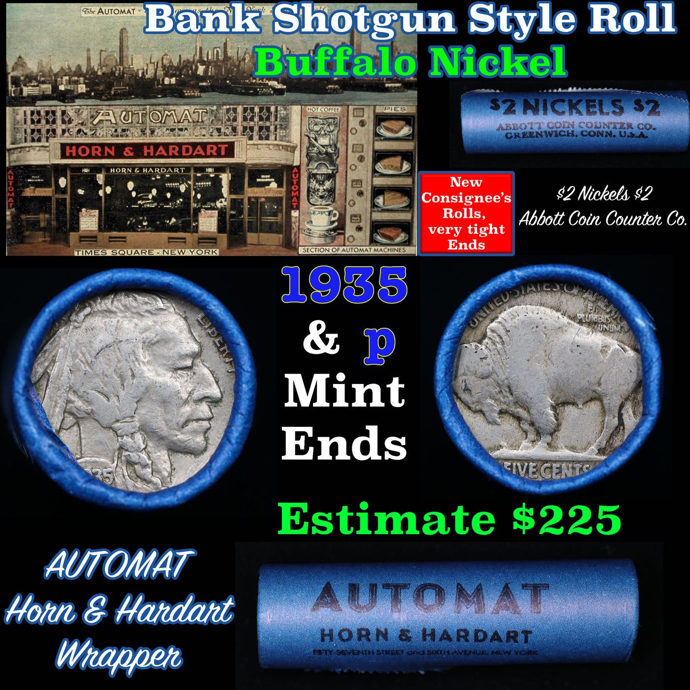 Buffalo Nickel Shotgun Roll in Old Bank Style ' Abbott Coin Counter' Wrapper 1935 & p Mint Ends. The roll is held in an old, rare "Brandt Abbott Coin Counter" Bank style wrapper. They are all from one estate, the ends on these rolls are very tight. We will guarantee they are all full dates.