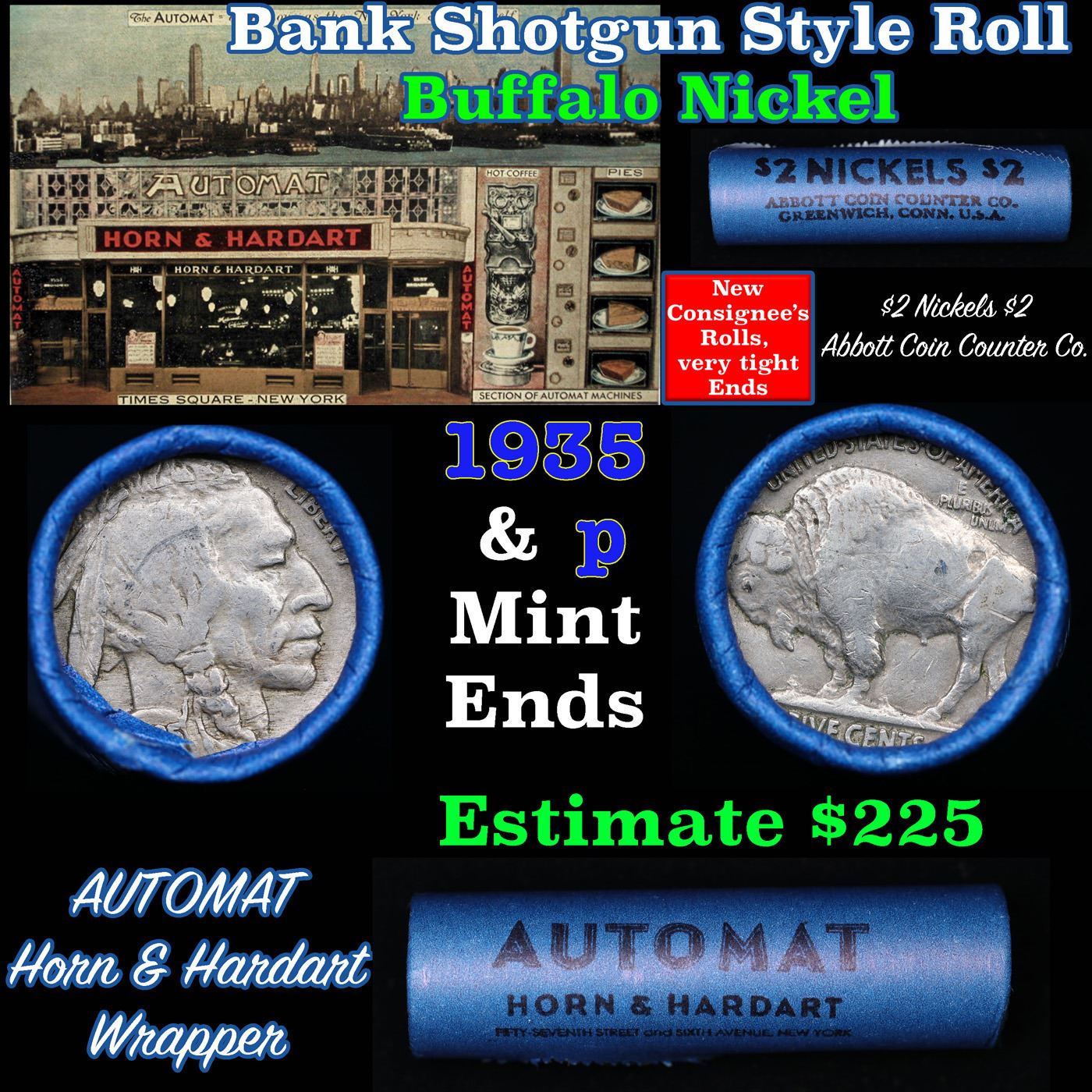 Buffalo Nickel Shotgun Roll in Old Bank Style ' Abbott Coin Counter' Wrapper 1935 & p Mint Ends. The roll is held in an old, rare "Brandt Abbott Coin Counter" Bank style wrapper. They are all from one estate, the ends on these rolls are very tight. We will guarantee they are all full dates.