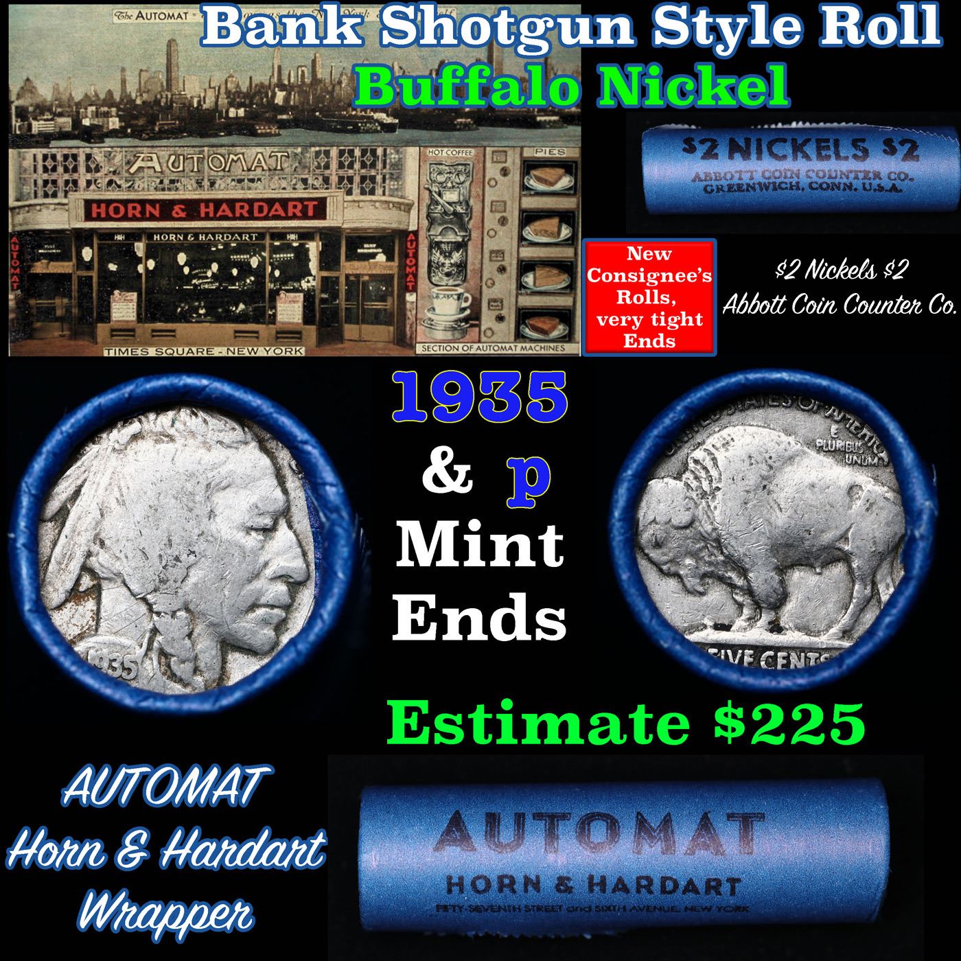 Buffalo Nickel Shotgun Roll in Old Bank Style ' Abbott Coin Counter' Wrapper 1935 & p Mint Ends. The roll is held in an old, rare "Brandt Abbott Coin Counter" Bank style wrapper. They are all from one estate, the ends on these rolls are very tight. We will guarantee they are all full dates.