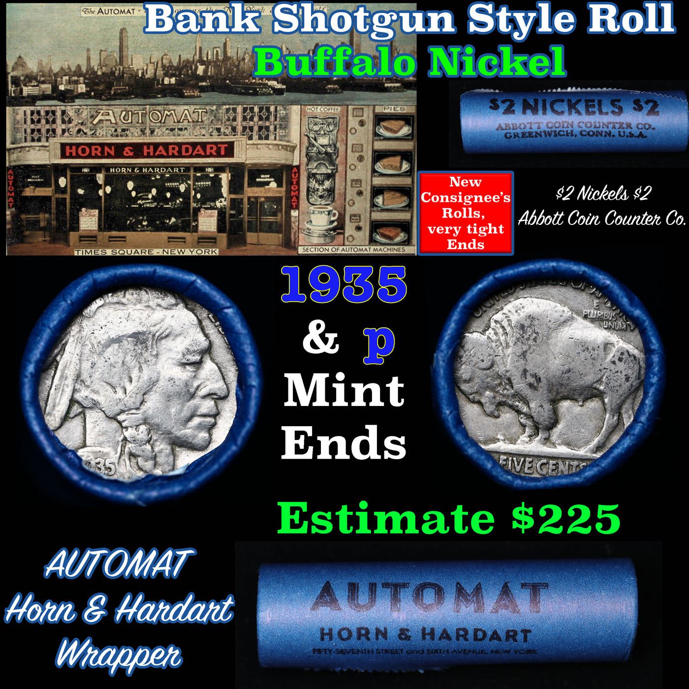 Buffalo Nickel Shotgun Roll in Old Bank Style ' Abbott Coin Counter' Wrapper 1935 & p Mint Ends. The roll is held in an old, rare "Brandt Abbott Coin Counter" Bank style wrapper. They are all from one estate, the ends on these rolls are very tight. We will guarantee they are all full dates.