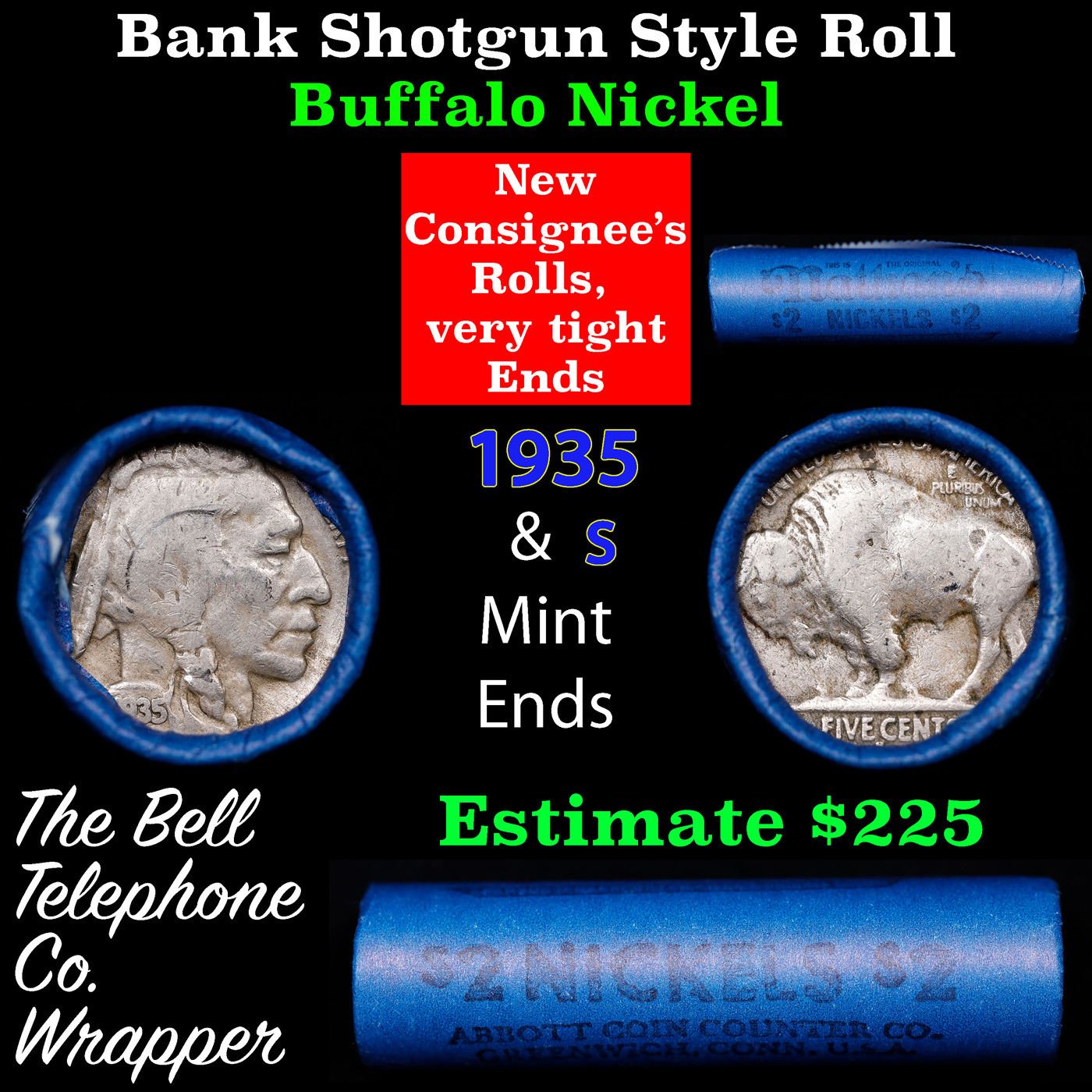 Buffalo Nickel Shotgun Roll in Old Bank Style 'Abbott Coin Counter' Wrapper 1935 & s Mint Ends. The roll is held in an old, rare "Brandt Abbott Coin Counter" Bank style wrapper. They are all from one estate, the ends on these rolls are very tight. We will guarantee they are all full dates.