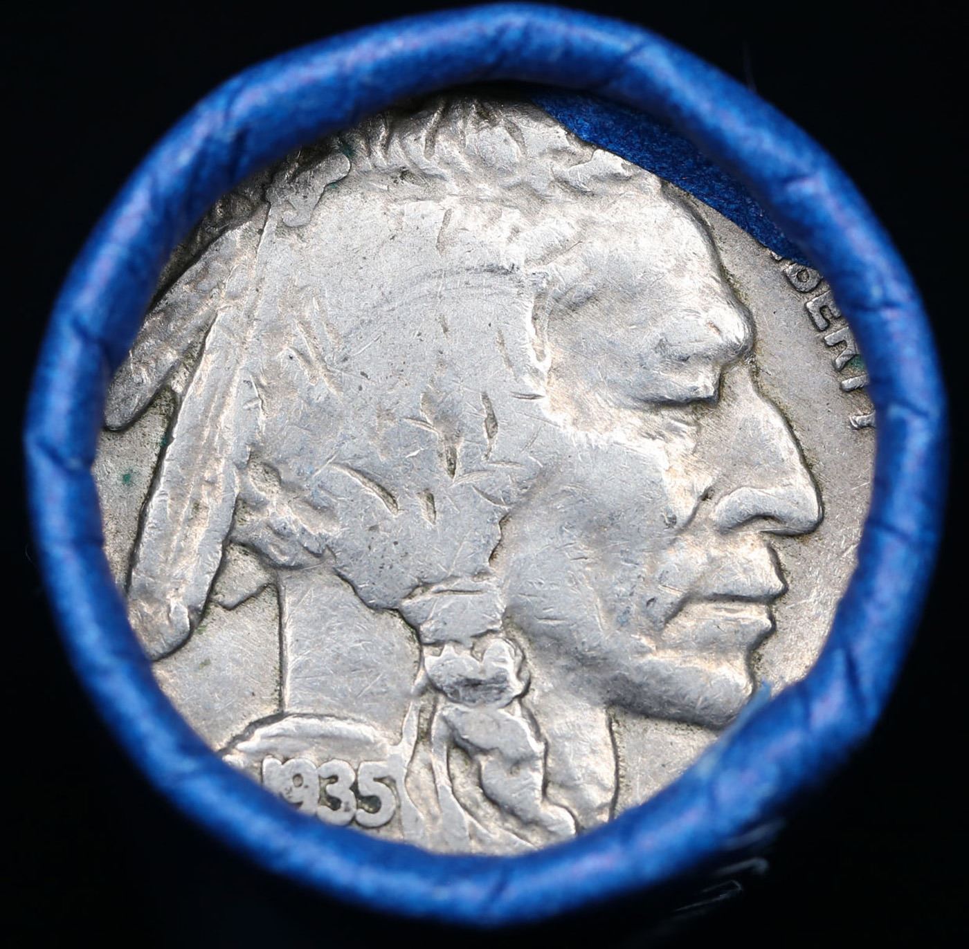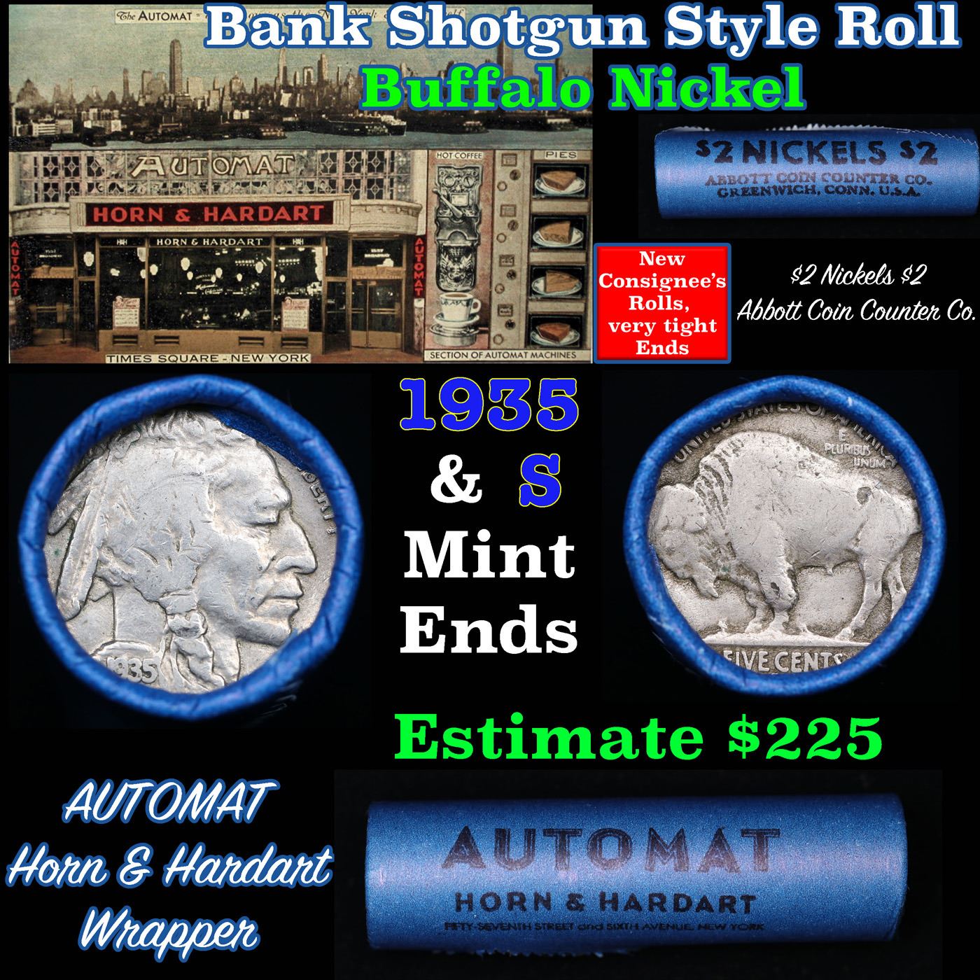 Buffalo Nickel Shotgun Roll in Old Bank Style ' Abbott Coin Counter' Wrapper 1935 & s Mint Ends. The roll is held in an old, rare "Brandt Abbott Coin Counter" Bank style wrapper. They are all from one estate, the ends on these rolls are very tight. We will guarantee they are all full dates.