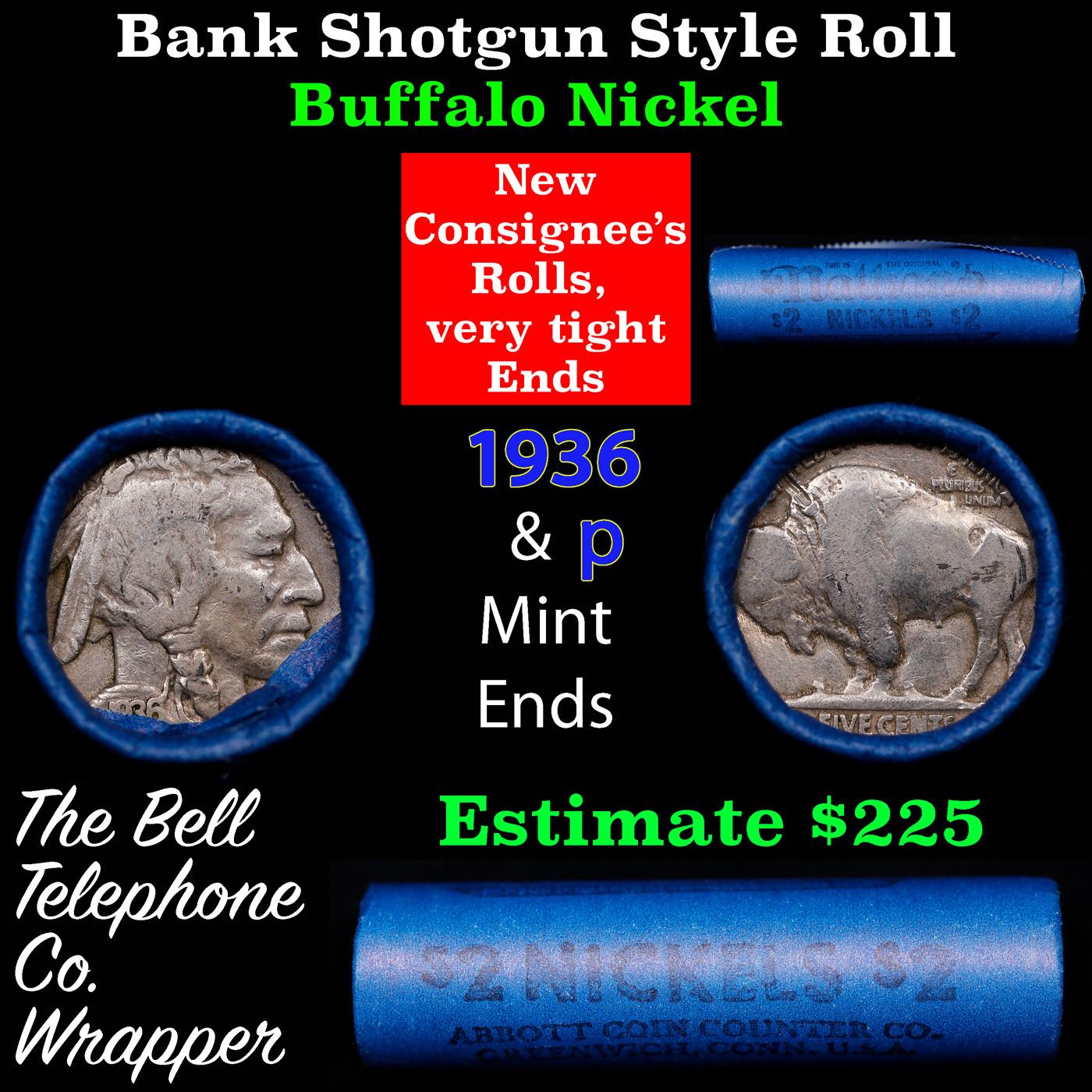 Buffalo Nickel Shotgun Roll in Old Bank Style 'Abbott Coin Counter' Wrapper 1936 & p Mint Ends. The roll is held in an old, rare "Brandt Abbott Coin Counter" Bank style wrapper. They are all from one estate, the ends on these rolls are very tight. We will guarantee they are all full dates.