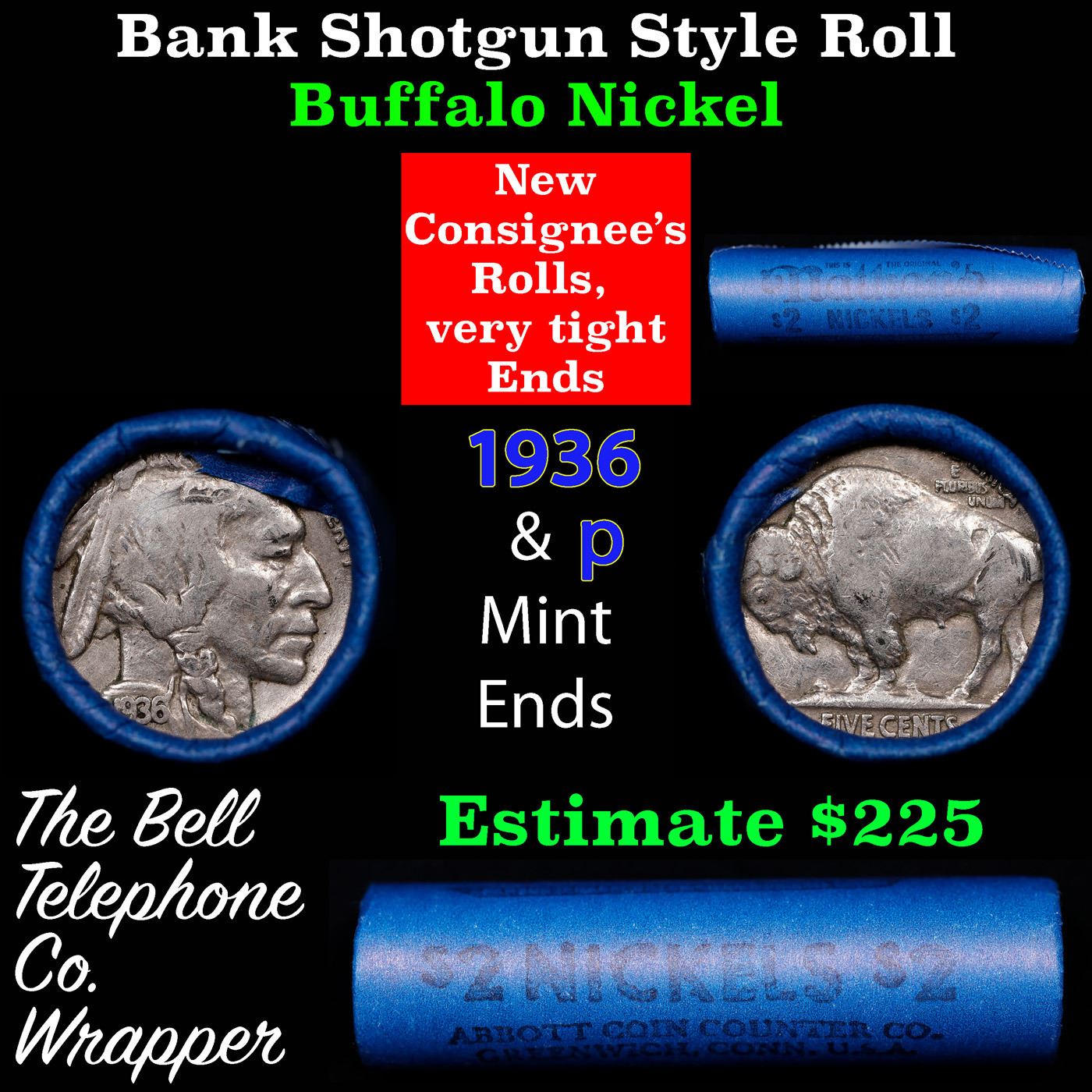 Buffalo Nickel Shotgun Roll in Old Bank Style 'Abbott Coin Counter' Wrapper 1936 & p Mint Ends. The roll is held in an old, rare "Brandt Abbott Coin Counter" Bank style wrapper. They are all from one estate, the ends on these rolls are very tight. We will guarantee they are all full dates.