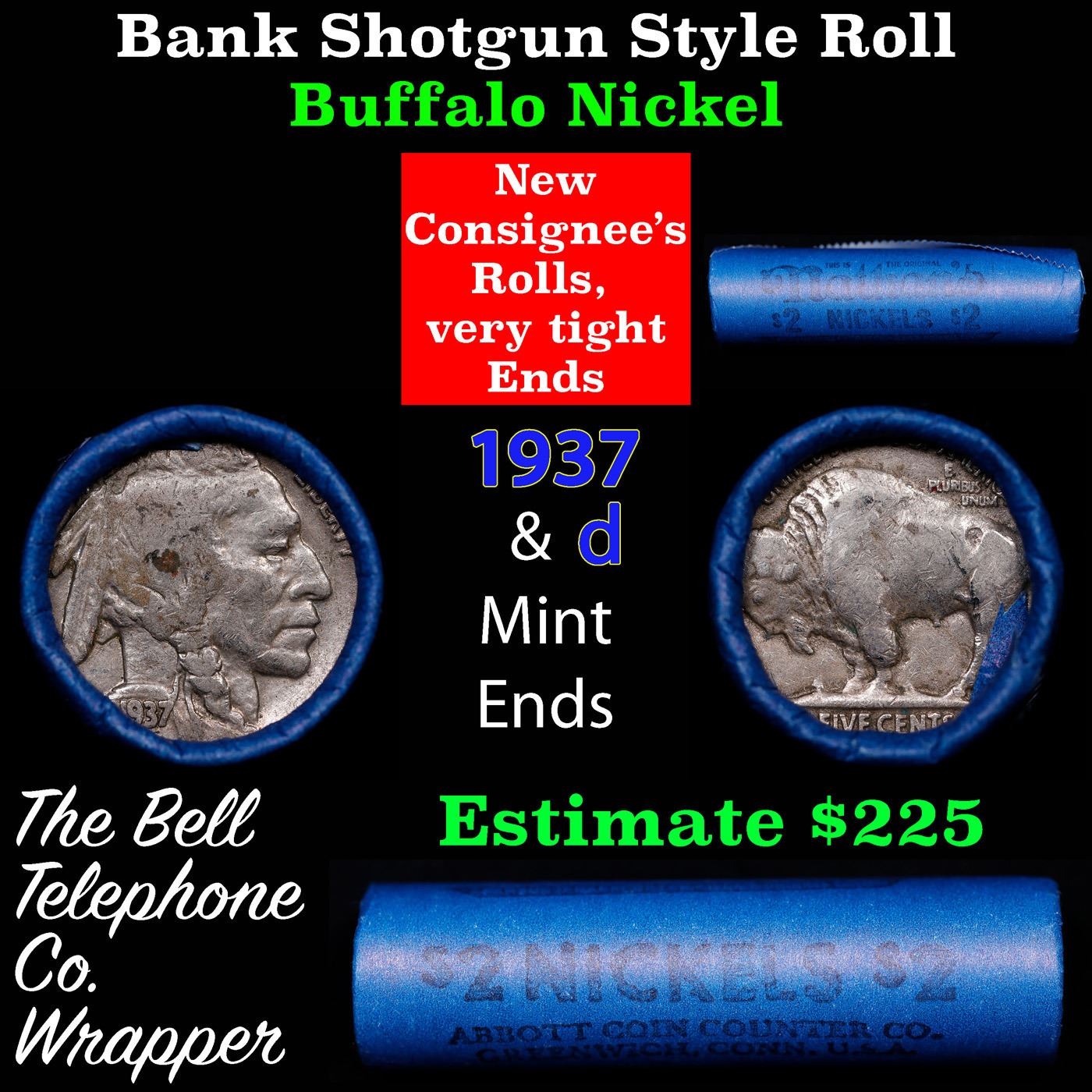 Buffalo Nickel Shotgun Roll in Old Bank Style 'Abbott Coin Counter' Wrapper 1937 & D Mint Ends. The roll is held in an old, rare "Brandt Abbott Coin Counter" Bank style wrapper. They are all from one estate, the ends on these rolls are very tight. We will guarantee they are all full dates.