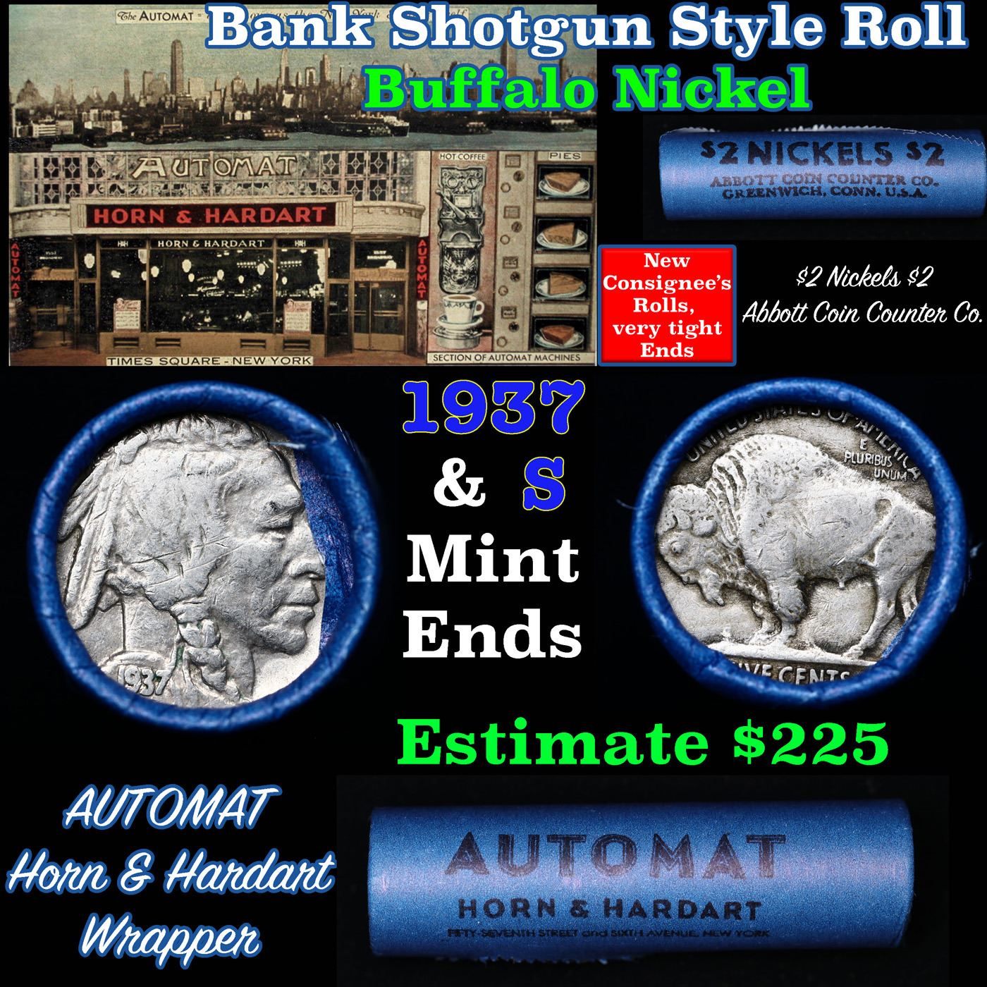 Buffalo Nickel Shotgun Roll in Old Bank Style ' Abbott Coin Counter' Wrapper 1937 & S Mint Ends. The roll is held in an old, rare "Brandt Abbott Coin Counter" Bank style wrapper. They are all from one estate, the ends on these rolls are very tight. We will guarantee they are all full dates.