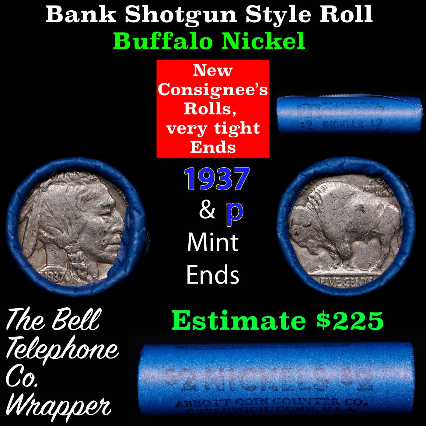 Buffalo Nickel Shotgun Roll in Old Bank Style 'Abbott Coin Counter' Wrapper 1937 & p Mint Ends. The roll is held in an old, rare "Brandt Abbott Coin Counter" Bank style wrapper. They are all from one estate, the ends on these rolls are very tight. We will guarantee they are all full dates.