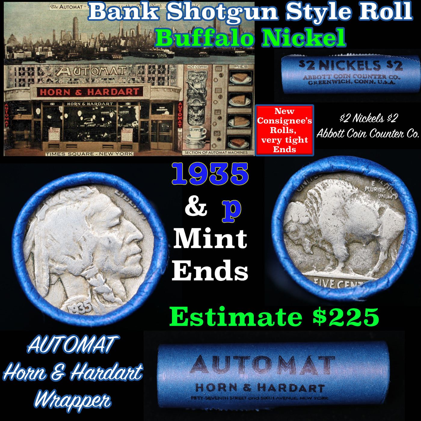 Buffalo Nickel Shotgun Roll in Old Bank Style 'Automat Horn & Hardart, Abbott Coin Counter' Wrapper 1935 & p Mint Ends. The roll is held in an old, rare "Automat Horn & Hardart, Abbott Coin Counter" Bank style wrapper. They are all from one estate, the ends on these rolls are very tight. We will guarantee they are all full dates.