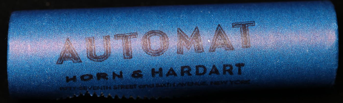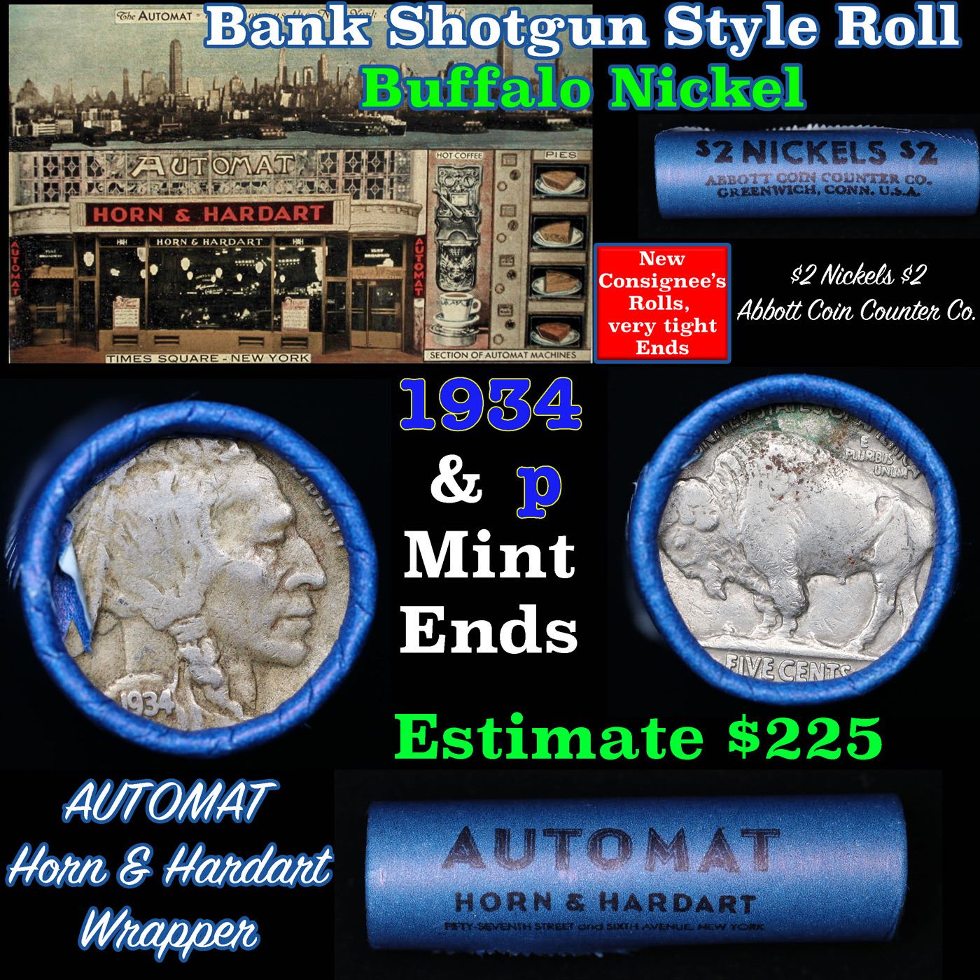 Buffalo Nickel Shotgun Roll in Old Bank Style 'Automat Horn & Hardart, Abbott Coin Counter' Wrapper 1934 & p Mint Ends. The roll is held in an old, rare "Automat Horn & Hardart, Abbott Coin Counter" Bank style wrapper. They are all from one estate, the ends on these rolls are very tight. We will guarantee they are all full dates.