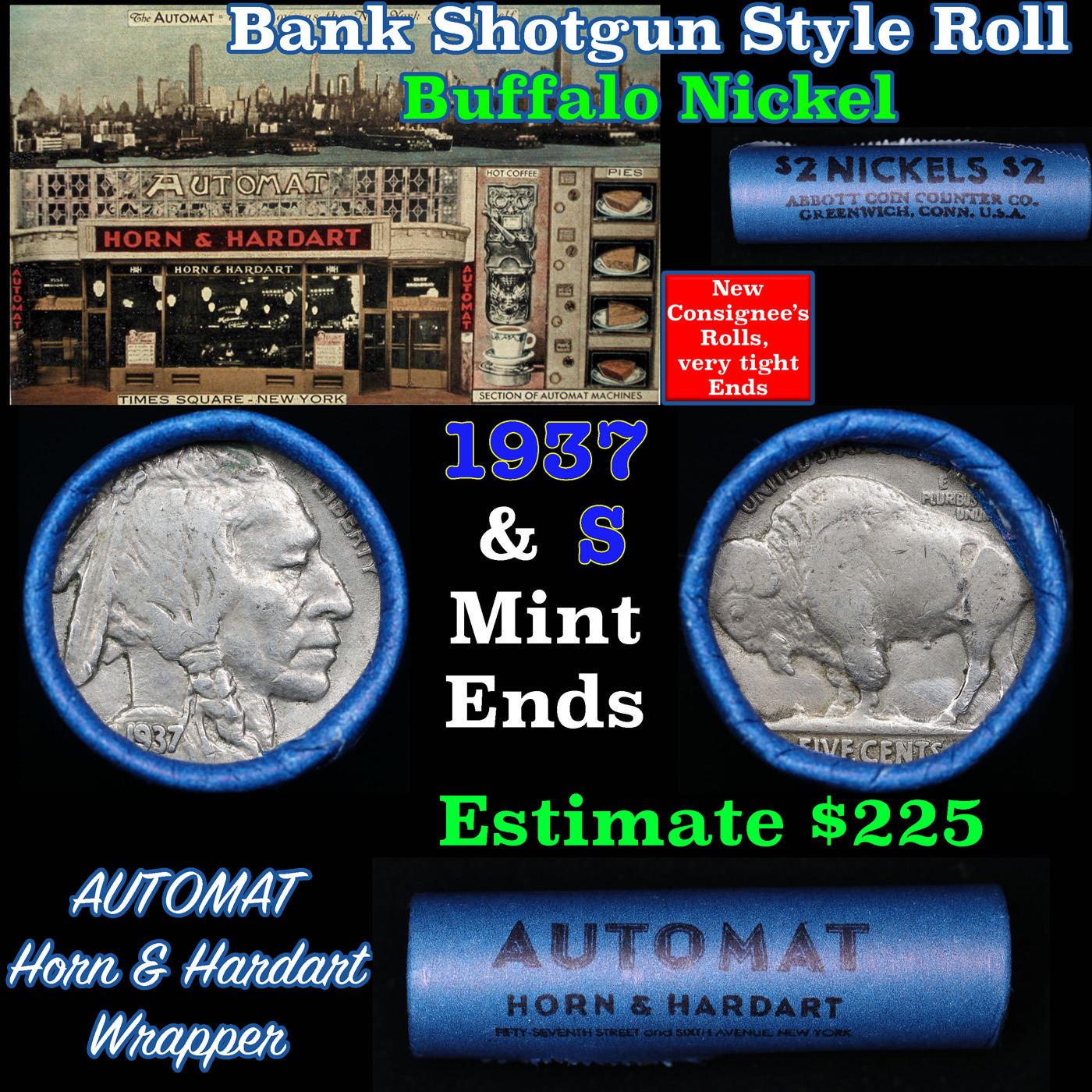 Buffalo Nickel Shotgun Roll in Old Bank Style 'Automat Horn & Hardart, Abbott Coin Counter' Wrapper 1937 & S Mint Ends. The roll is held in an old, rare "Automat Horn & Hardart, Abbott Coin Counter" Bank style wrapper. They are all from one estate, the ends on these rolls are very tight. We will guarantee they are all full dates.