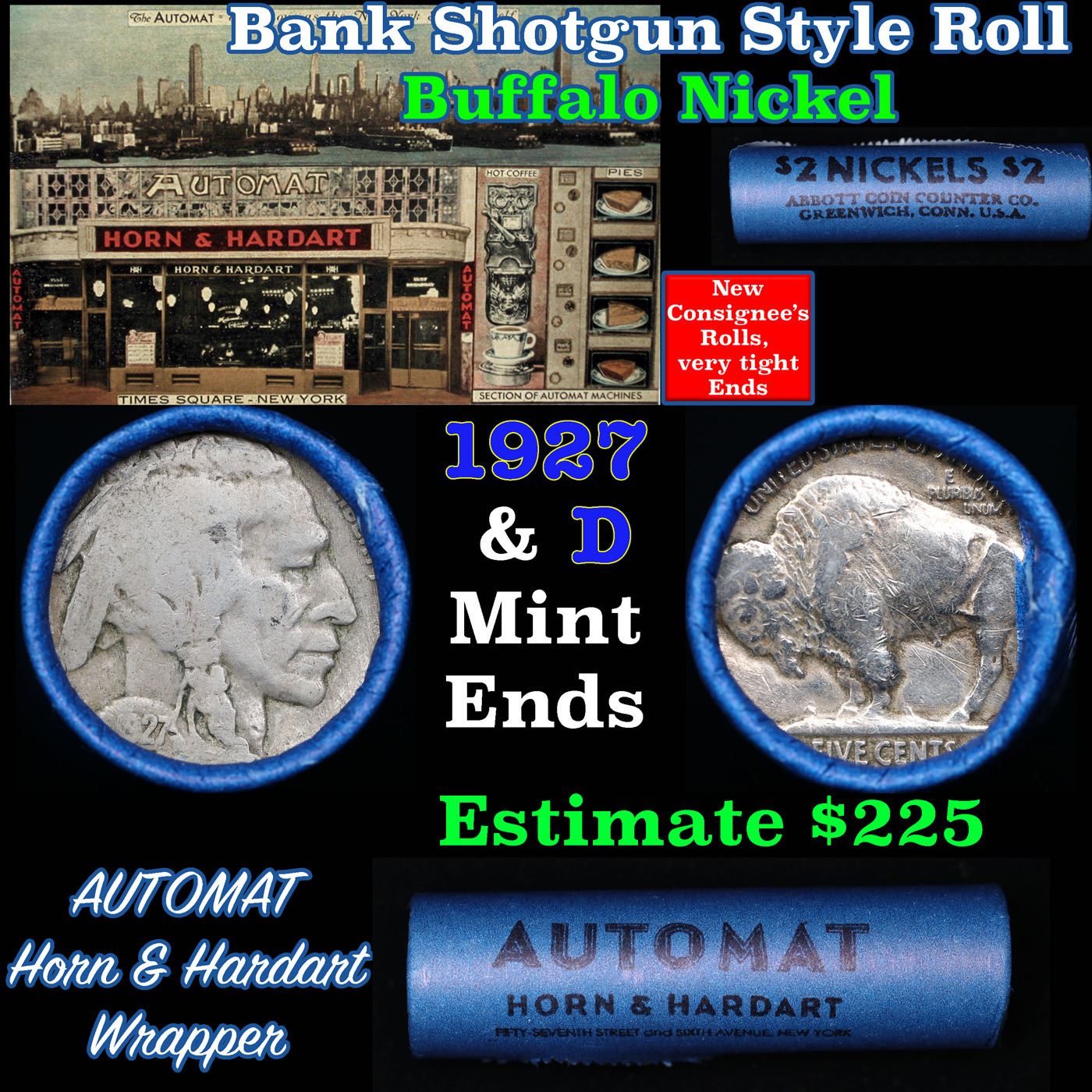Buffalo Nickel Shotgun Roll in Old Bank Style 'Automat Horn & Hardart, Abbott Coin Counter' Wrapper 1927 & D Mint Ends. The roll is held in an old, rare "Automat Horn & Hardart, Abbott Coin Counter" Bank style wrapper. They are all from one estate, the ends on these rolls are very tight. We will guarantee they are all full dates.