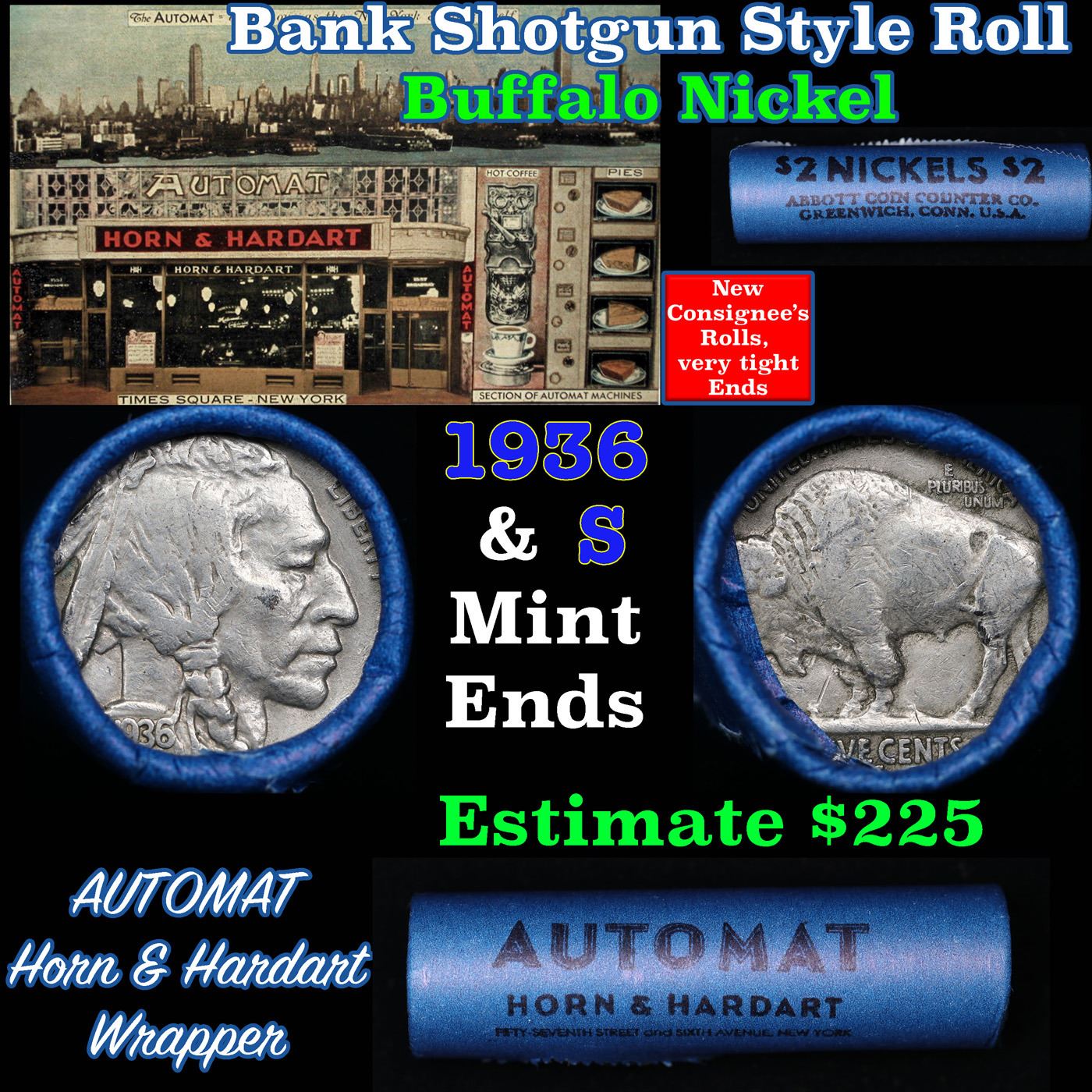 Buffalo Nickel Shotgun Roll in Old Bank Style 'Automat Horn & Hardart, Abbott Coin Counter' Wrapper 1936 & S Mint Ends. The roll is held in an old, rare "Automat Horn & Hardart, Abbott Coin Counter" Bank style wrapper. They are all from one estate, the ends on these rolls are very tight. We will guarantee they are all full dates.