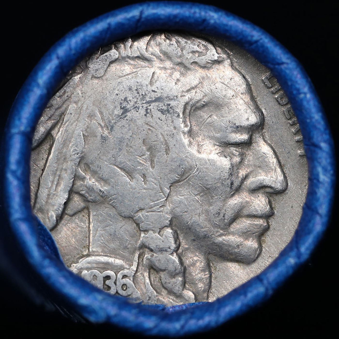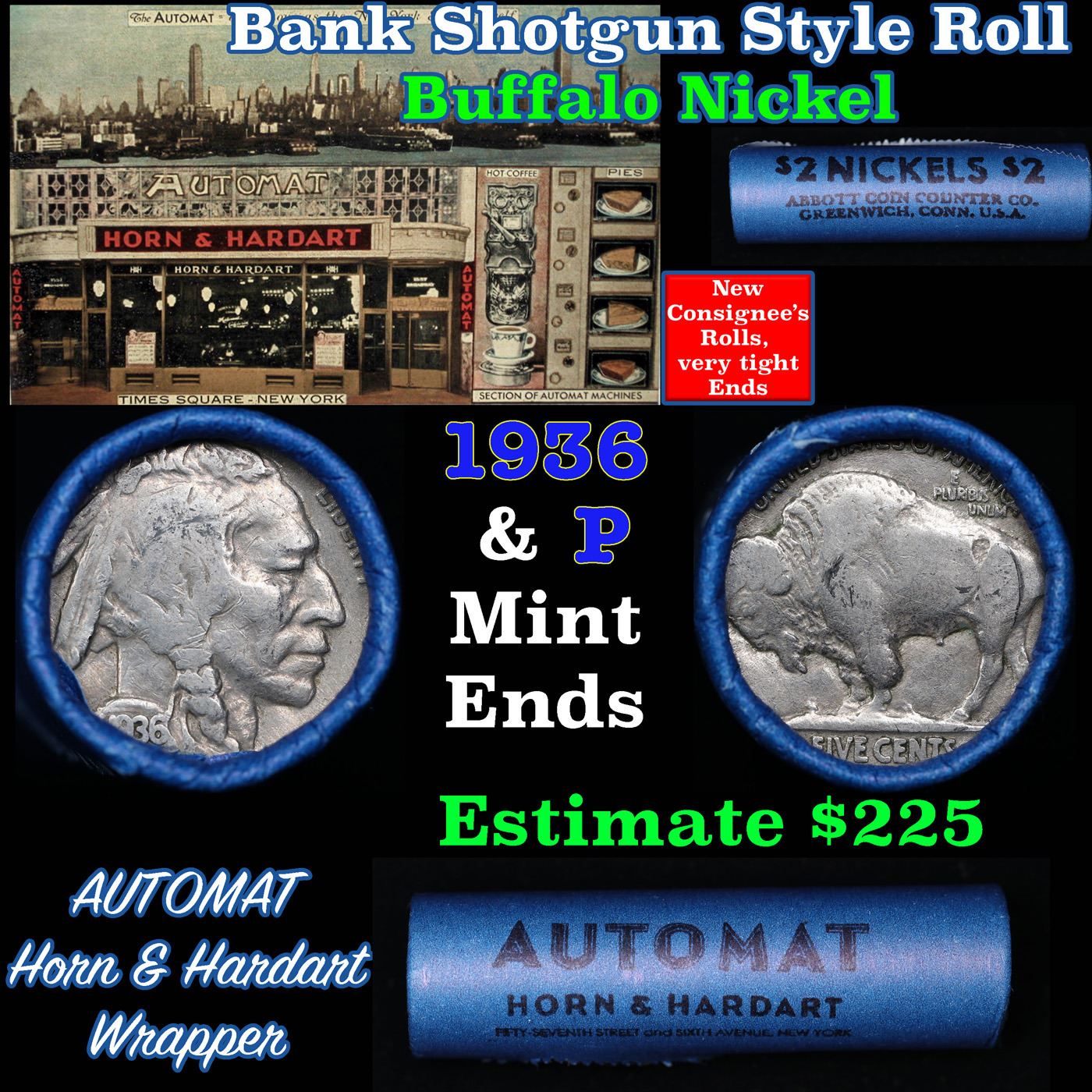 Buffalo Nickel Shotgun Roll in Old Bank Style 'Automat Horn & Hardart, Abbott Coin Counter' Wrapper 1936 & p Mint Ends. The roll is held in an old, rare "Automat Horn & Hardart, Abbott Coin Counter" Bank style wrapper. They are all from one estate, the ends on these rolls are very tight. We will guarantee they are all full dates.