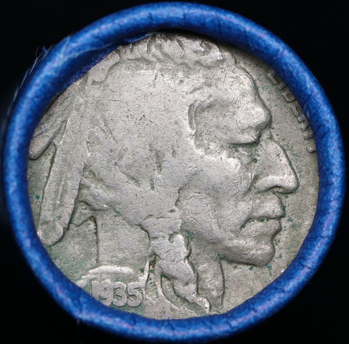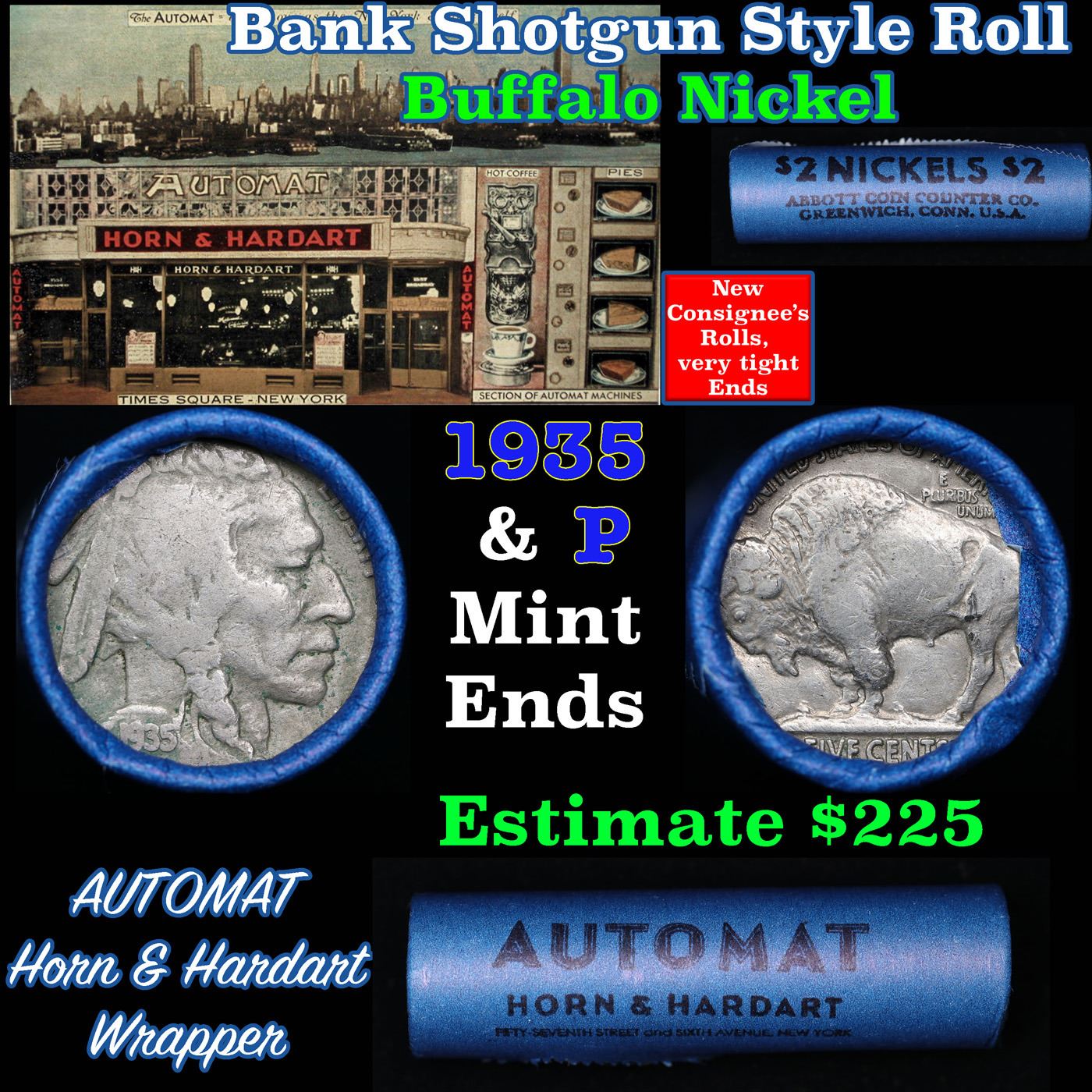 Buffalo Nickel Shotgun Roll in Old Bank Style 'Automat Horn & Hardart, Abbott Coin Counter' Wrapper 1935 & p Mint Ends. The roll is held in an old, rare "Automat Horn & Hardart, Abbott Coin Counter" Bank style wrapper. They are all from one estate, the ends on these rolls are very tight. We will guarantee they are all full dates.
