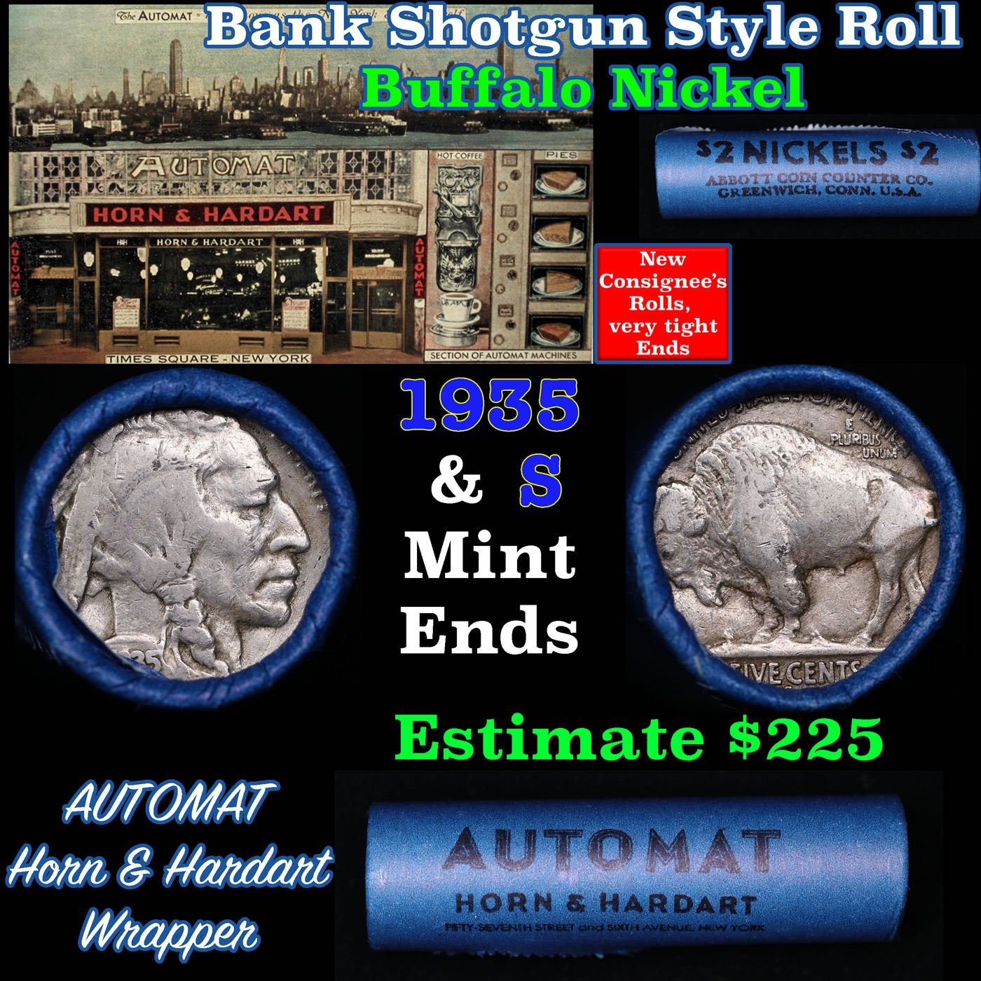 Buffalo Nickel Shotgun Roll in Old Bank Style 'Automat Horn & Hardart, Abbott Coin Counter' Wrapper 1935 & S Mint Ends. The roll is held in an old, rare "Automat Horn & Hardart, Abbott Coin Counter" Bank style wrapper. They are all from one estate, the ends on these rolls are very tight. We will guarantee they are all full dates.
