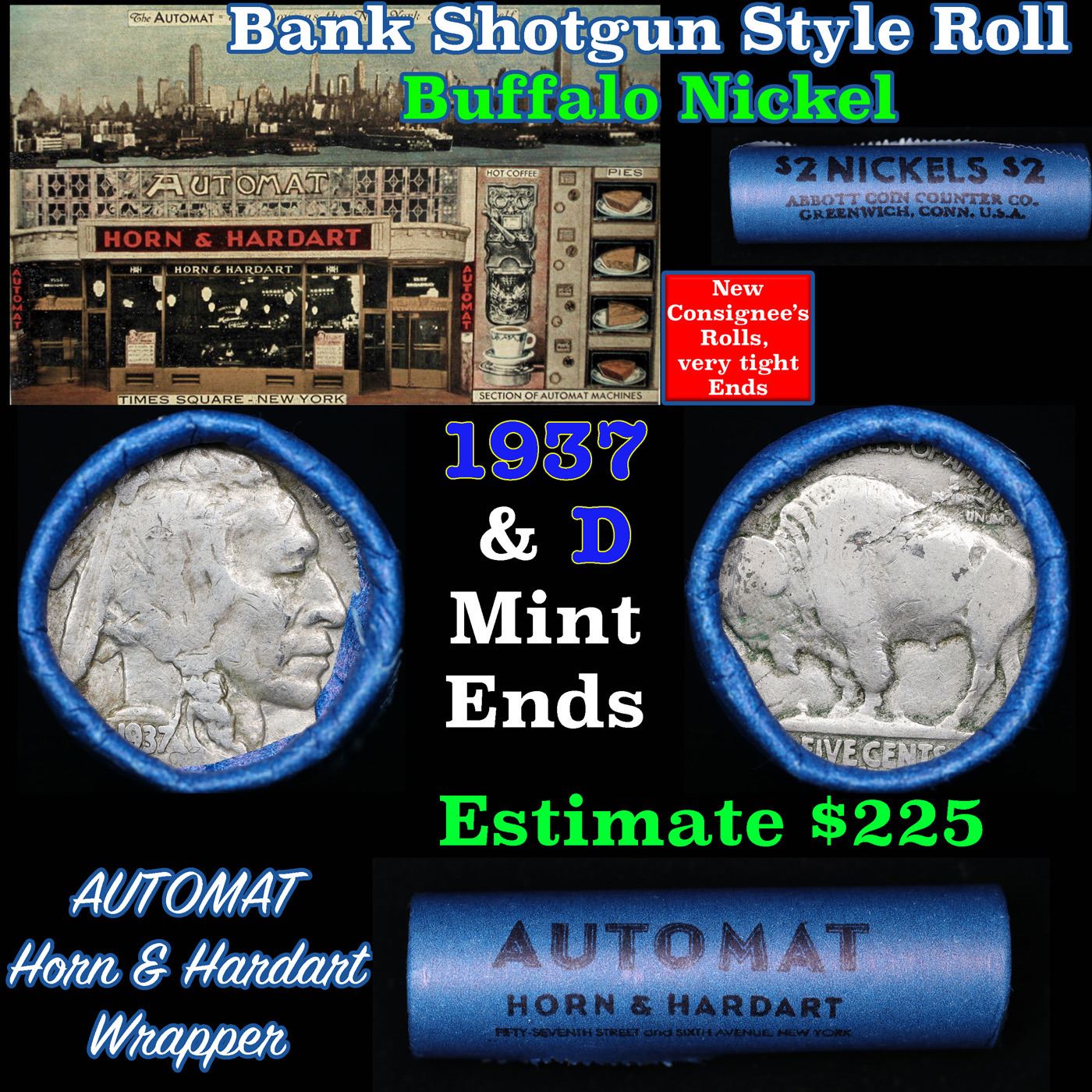 Buffalo Nickel Shotgun Roll in Old Bank Style 'Automat Horn & Hardart, Abbott Coin Counter' Wrapper 1937 & d Mint Ends. The roll is held in an old, rare "Automat Horn & Hardart, Abbott Coin Counter" Bank style wrapper. They are all from one estate, the ends on these rolls are very tight. We will guarantee they are all full dates.