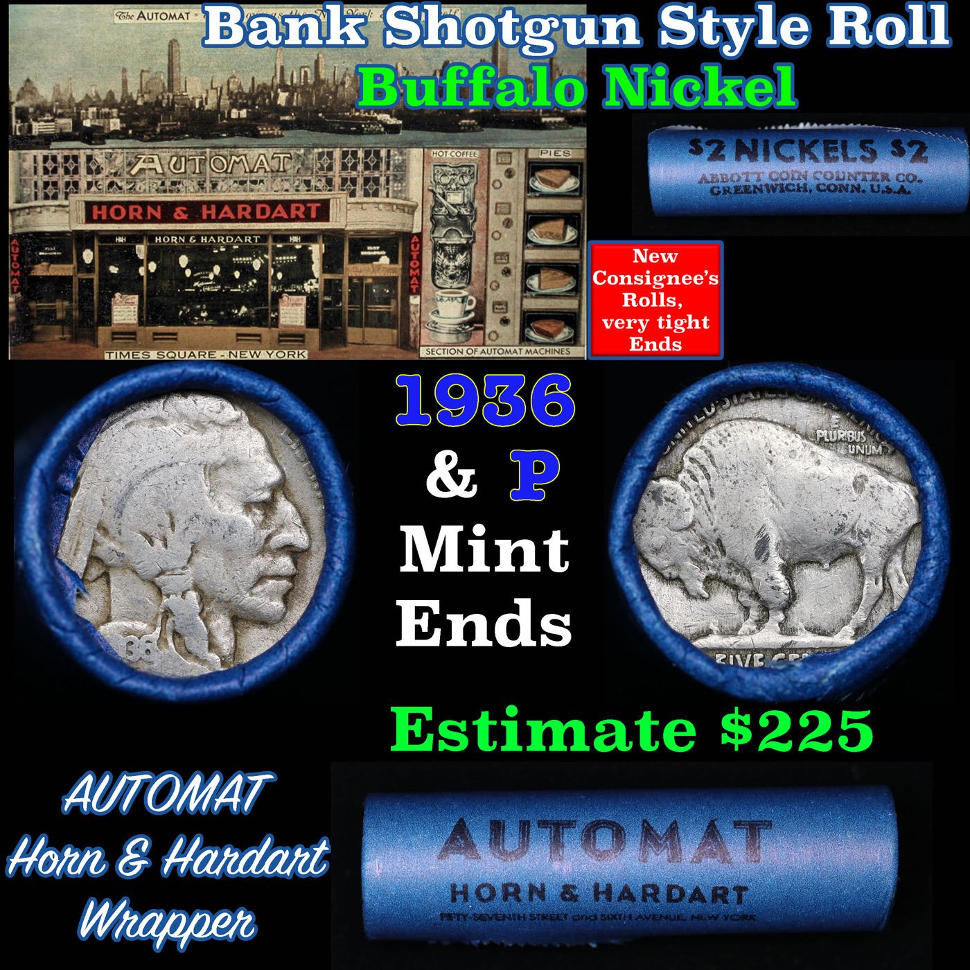 Buffalo Nickel Shotgun Roll in Old Bank Style 'Automat Horn & Hardart, Abbott Coin Counter' Wrapper 1936 & p Mint Ends. The roll is held in an old, rare "Automat Horn & Hardart, Abbott Coin Counter" Bank style wrapper. They are all from one estate, the ends on these rolls are very tight. We will guarantee they are all full dates.