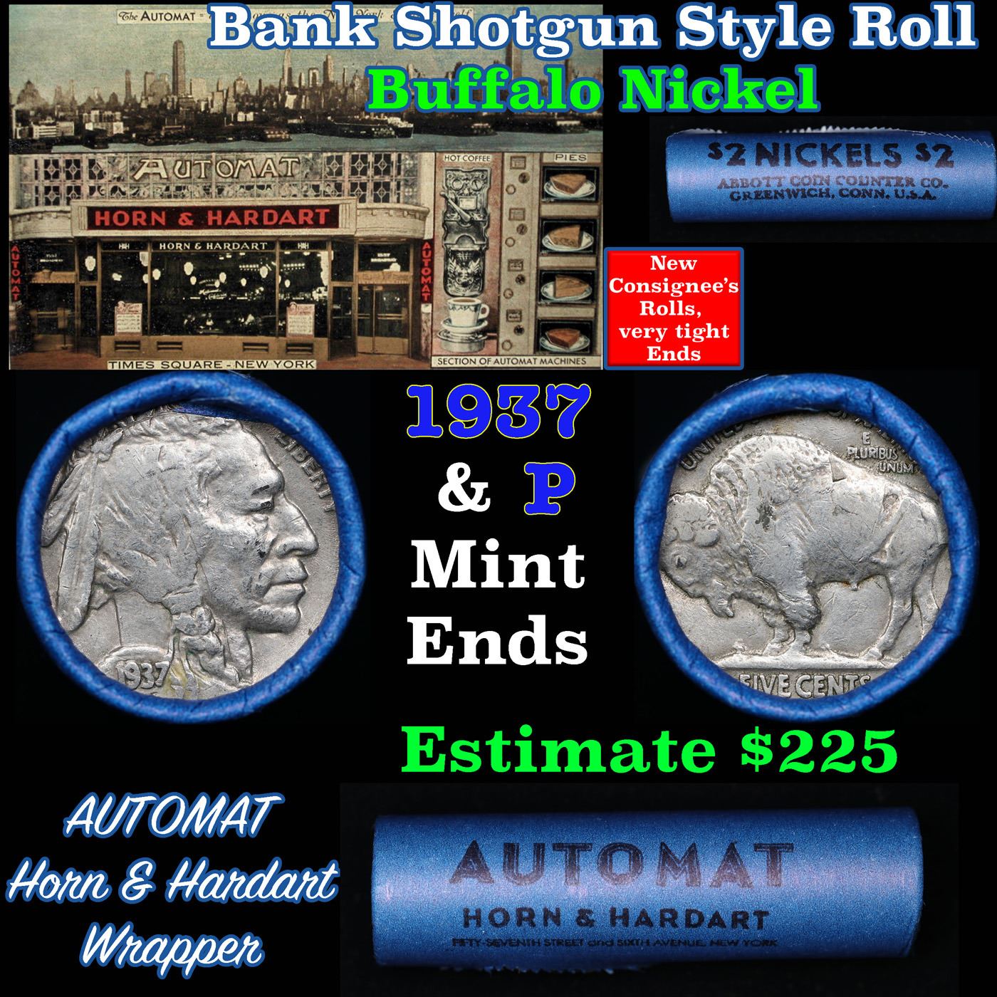 Buffalo Nickel Shotgun Roll in Old Bank Style 'Automat Horn & Hardart, Abbott Coin Counter' Wrapper 1937 & p Mint Ends. The roll is held in an old, rare "Automat Horn & Hardart, Abbott Coin Counter" Bank style wrapper. They are all from one estate, the ends on these rolls are very tight. We will guarantee they are all full dates.