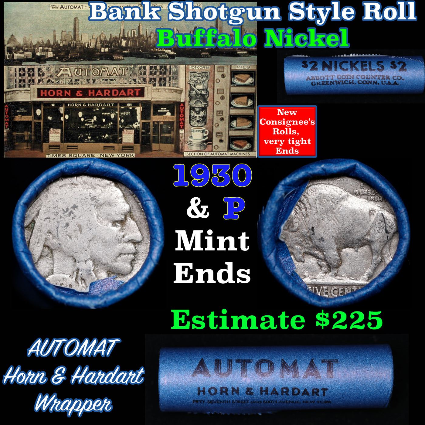 Buffalo Nickel Shotgun Roll in Old Bank Style 'Automat Horn & Hardart, Abbott Coin Counter' Wrapper 1930 & p Mint Ends. The roll is held in an old, rare "Automat Horn & Hardart, Abbott Coin Counter" Bank style wrapper. They are all from one estate, the ends on these rolls are very tight. We will guarantee they are all full dates.