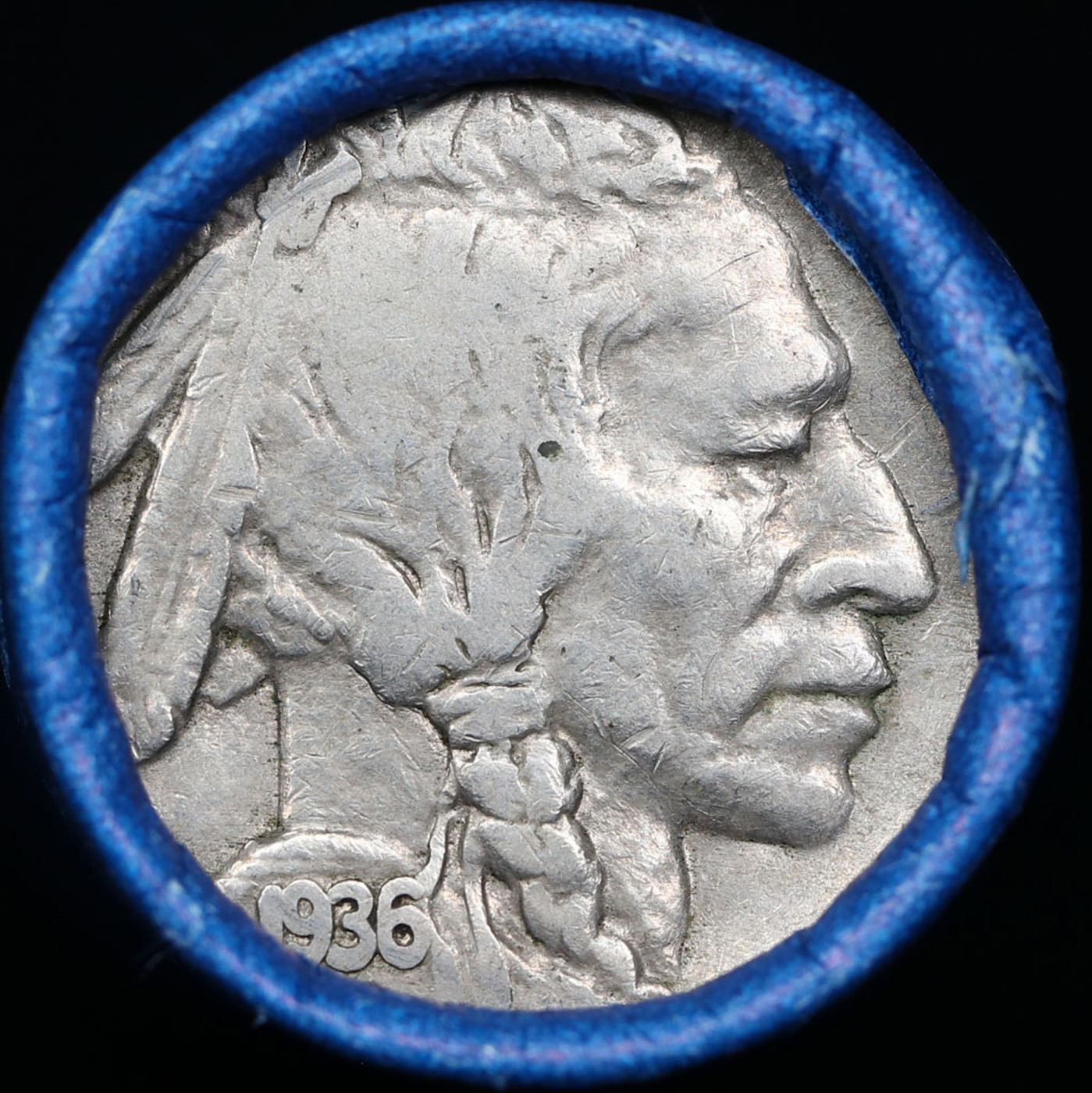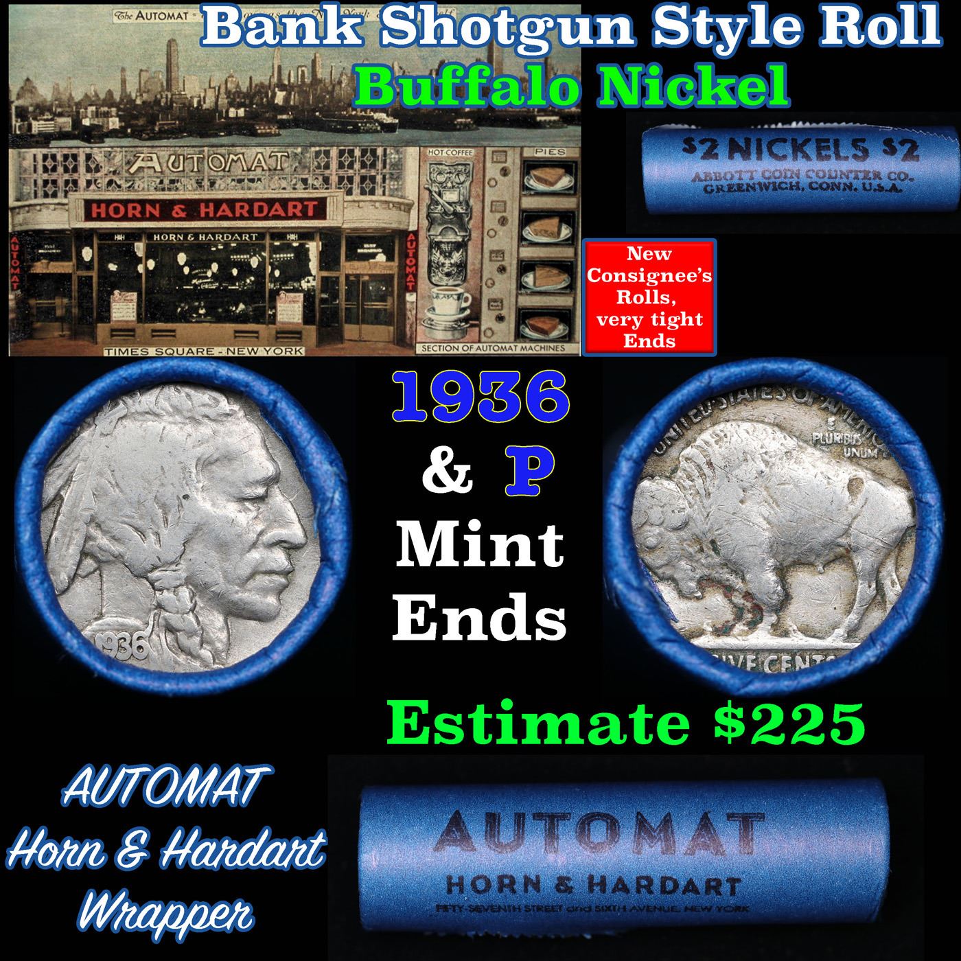 Buffalo Nickel Shotgun Roll in Old Bank Style 'Automat Horn & Hardart, Abbott Coin Counter' Wrapper 1936 & p Mint Ends. The roll is held in an old, rare "Automat Horn & Hardart, Abbott Coin Counter" Bank style wrapper. They are all from one estate, the ends on these rolls are very tight. We will guarantee they are all full dates.