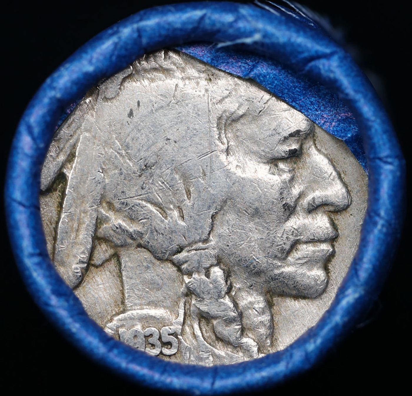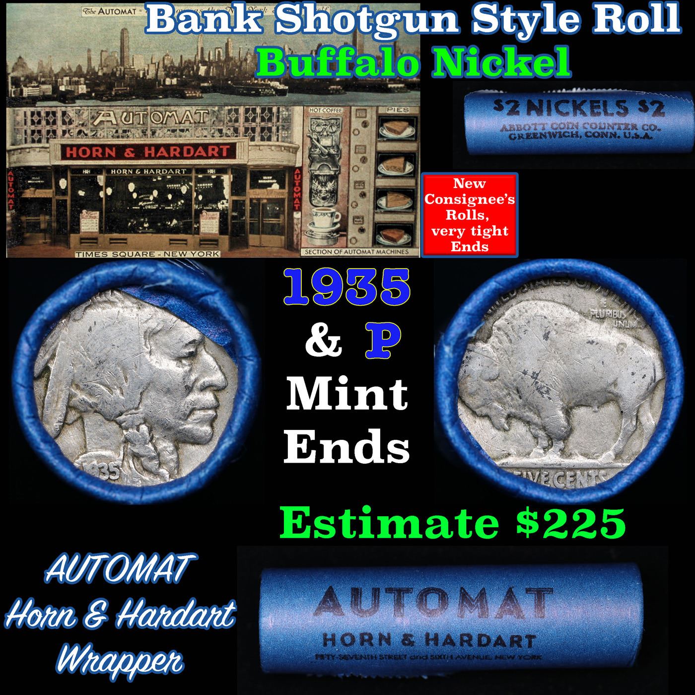 Buffalo Nickel Shotgun Roll in Old Bank Style 'Automat Horn & Hardart, Abbott Coin Counter' Wrapper 1935 & p Mint Ends. The roll is held in an old, rare "Automat Horn & Hardart, Abbott Coin Counter" Bank style wrapper. They are all from one estate, the ends on these rolls are very tight. We will guarantee they are all full dates.