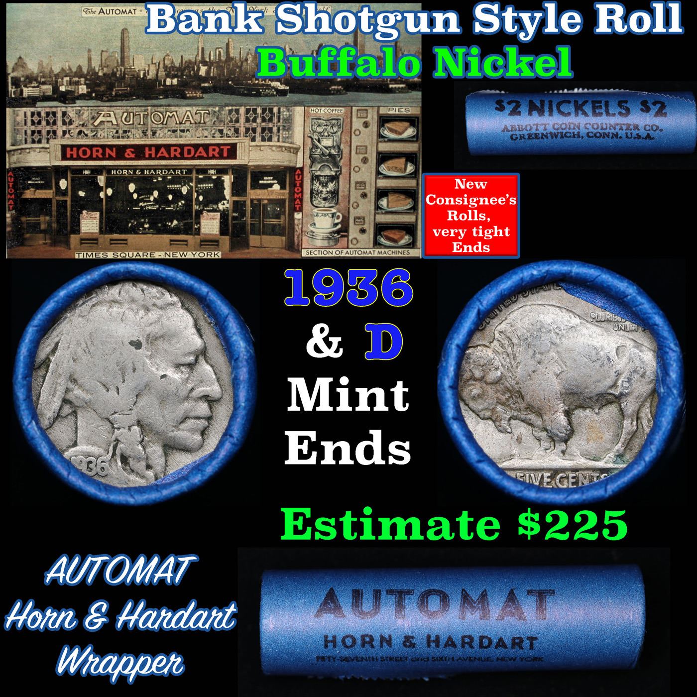 Buffalo Nickel Shotgun Roll in Old Bank Style 'Automat Horn & Hardart, Abbott Coin Counter' Wrapper 1936 & d Mint Ends. The roll is held in an old, rare "Automat Horn & Hardart, Abbott Coin Counter" Bank style wrapper. They are all from one estate, the ends on these rolls are very tight. We will guarantee they are all full dates.