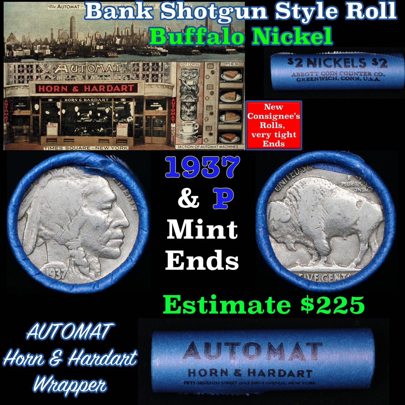 Buffalo Nickel Shotgun Roll in Old Bank Style 'Automat Horn & Hardart, Abbott Coin Counter' Wrapper 1937 & p Mint Ends. The roll is held in an old, rare "Automat Horn & Hardart, Abbott Coin Counter" Bank style wrapper. They are all from one estate, the ends on these rolls are very tight. We will guarantee they are all full dates.