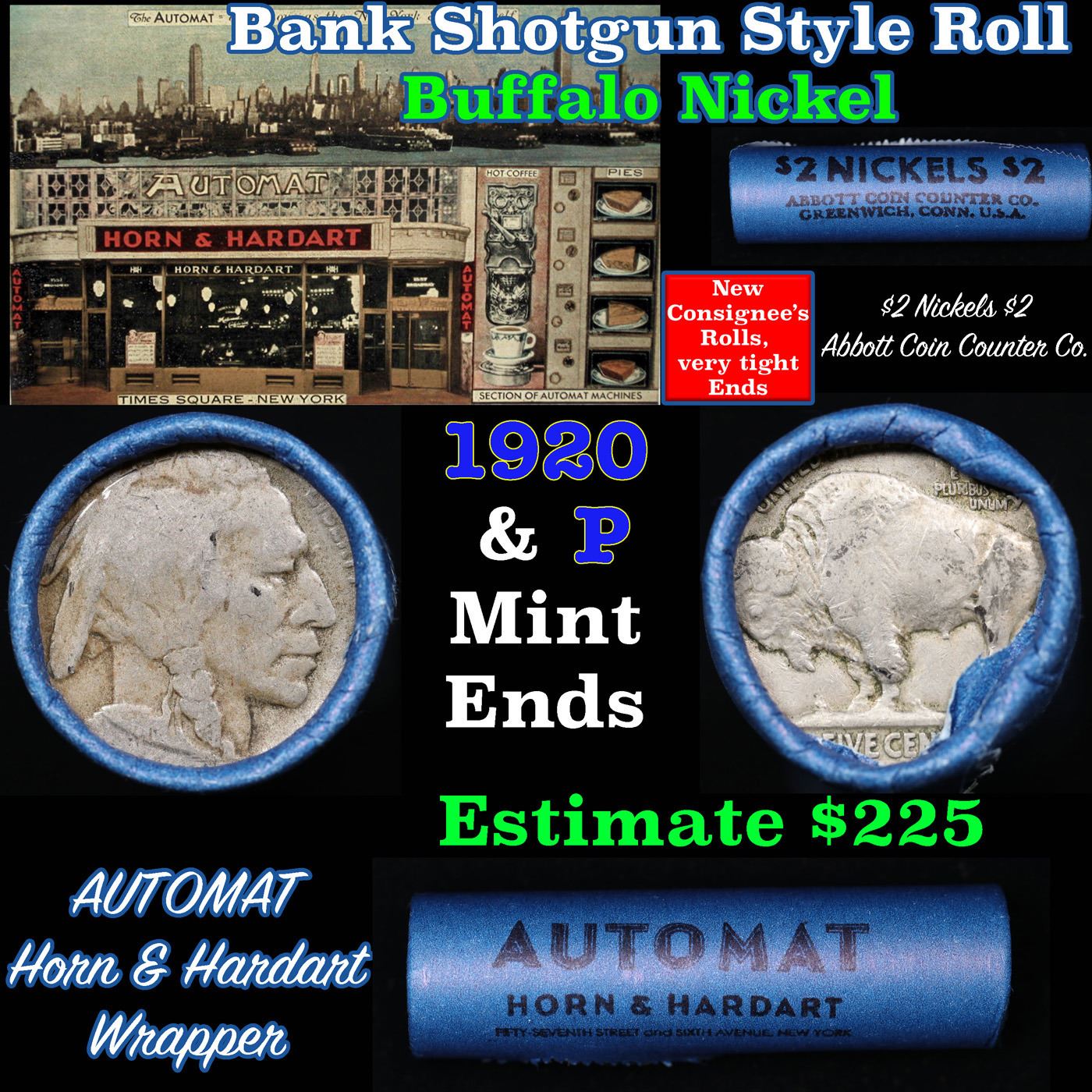 Buffalo Nickel Shotgun Roll in Old Bank Style 'Automat Horn & Hardart, Abbott Coin Counter' Wrapper 1928 & p Mint Ends. The roll is held in an old, rare "Automat Horn & Hardart, Abbott Coin Counter" Bank style wrapper. They are all from one estate, the ends on these rolls are very tight. We will guarantee they are all full dates.