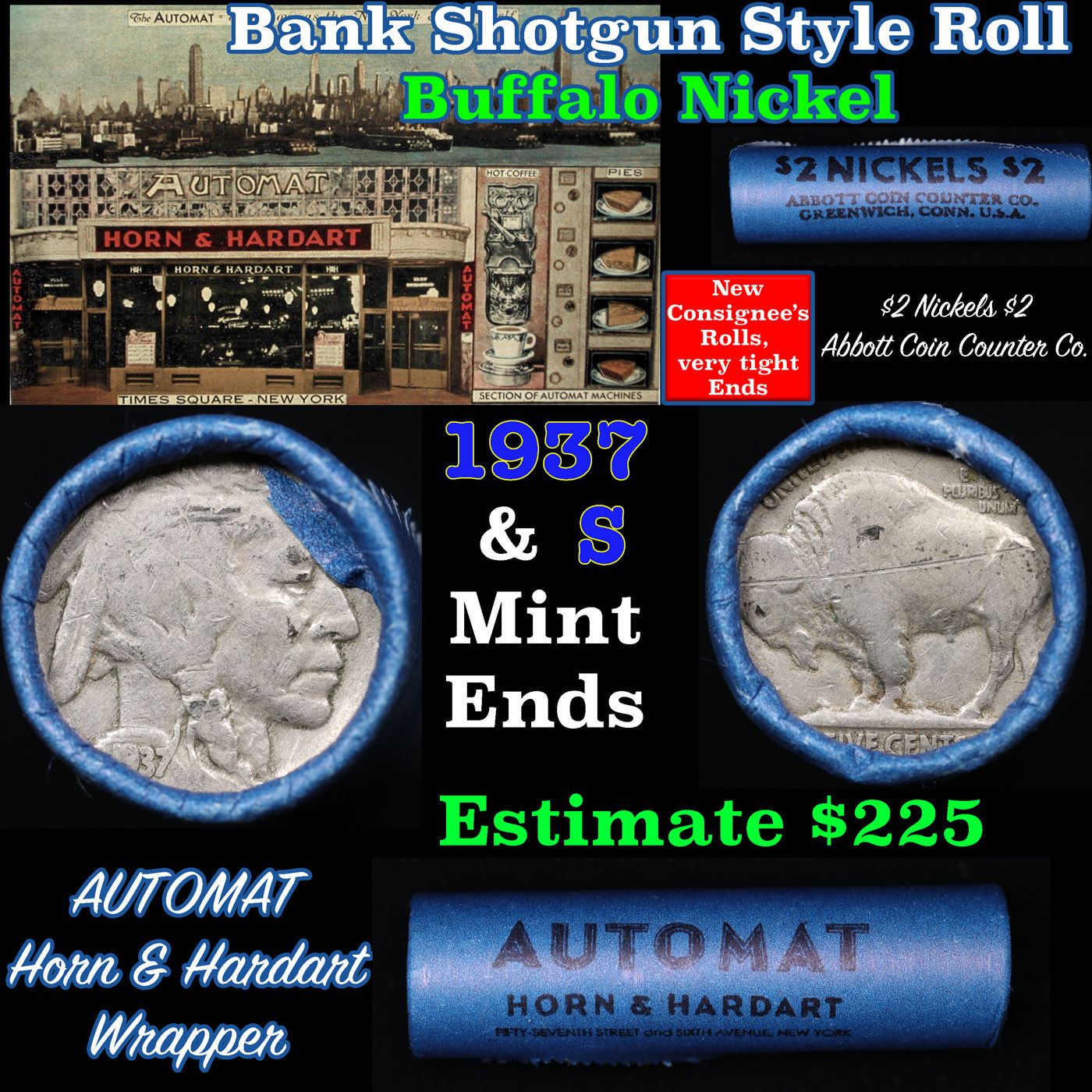 Buffalo Nickel Shotgun Roll in Old Bank Style 'Automat Horn & Hardart, Abbott Coin Counter' Wrapper 1937 & s Mint Ends. The roll is held in an old, rare "Automat Horn & Hardart, Abbott Coin Counter" Bank style wrapper. They are all from one estate, the ends on these rolls are very tight. We will guarantee they are all full dates.