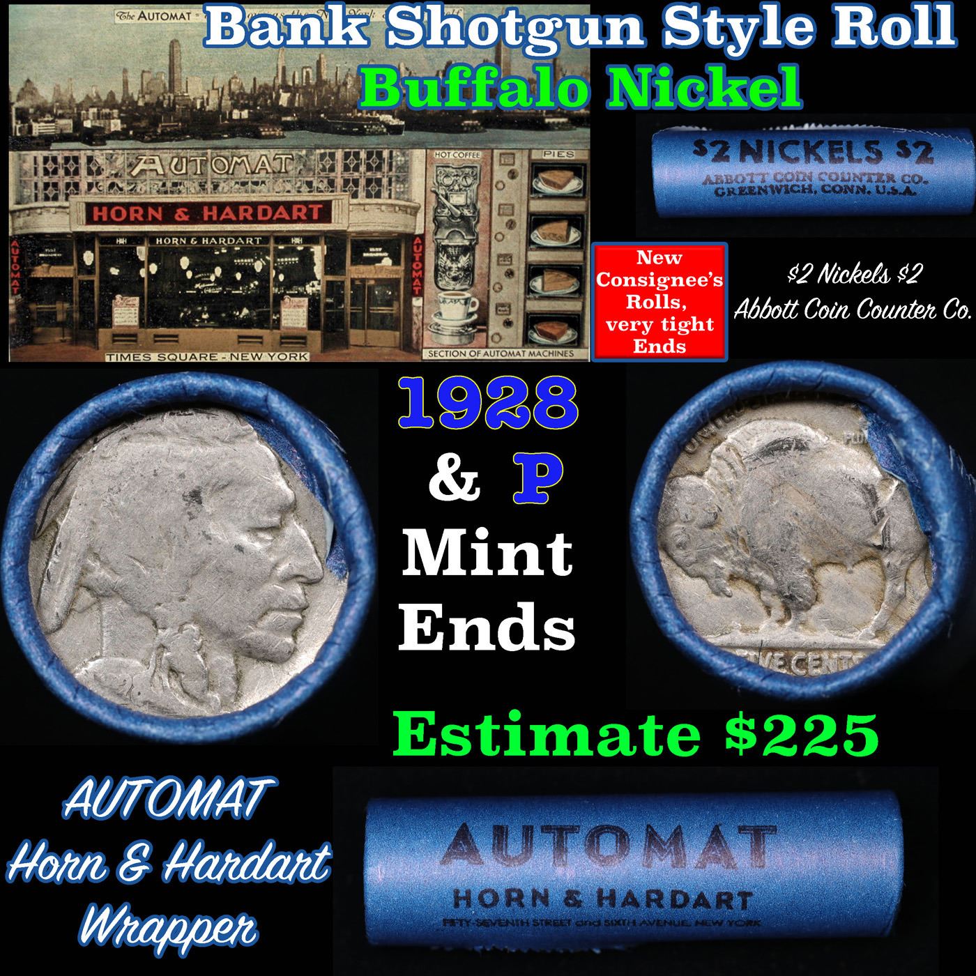 Buffalo Nickel Shotgun Roll in Old Bank Style 'Automat Horn & Hardart, Abbott Coin Counter' Wrapper 1928 & p Mint Ends. The roll is held in an old, rare "Automat Horn & Hardart, Abbott Coin Counter" Bank style wrapper. They are all from one estate, the ends on these rolls are very tight. We will guarantee they are all full dates.