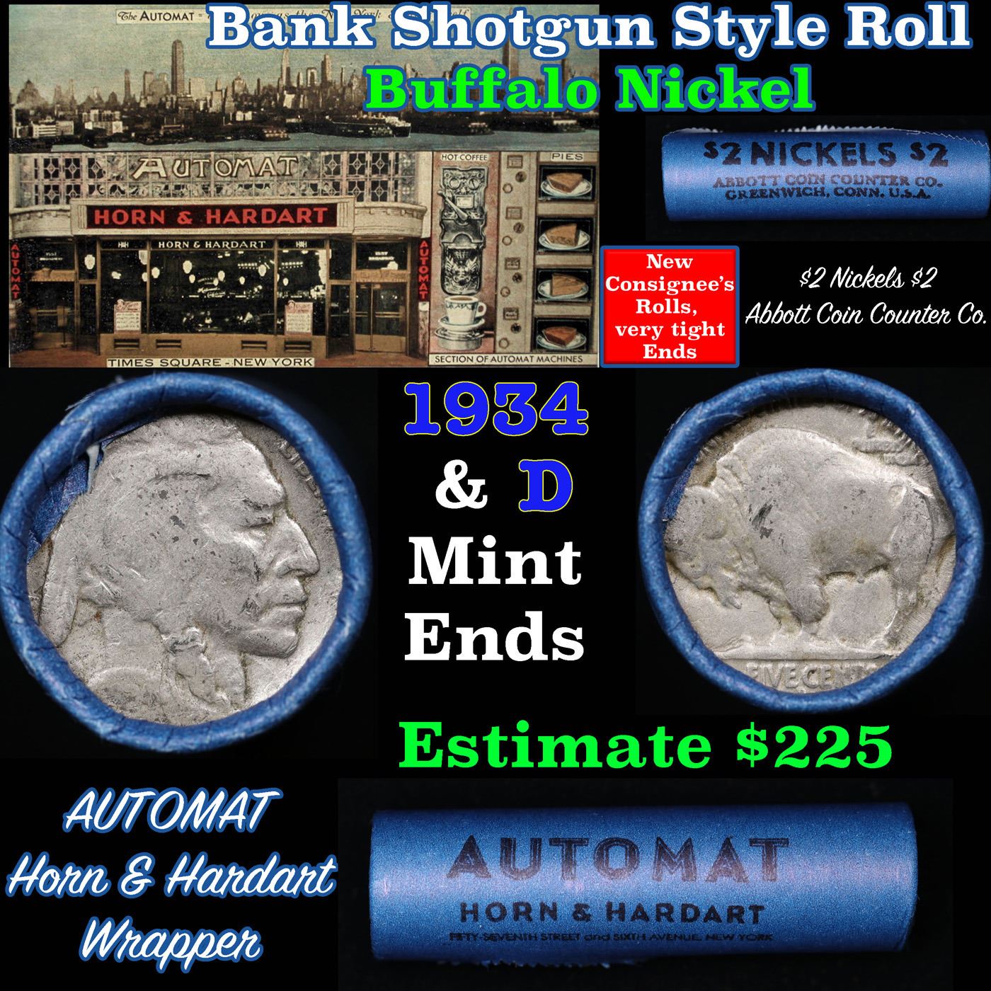 Buffalo Nickel Shotgun Roll in Old Bank Style 'Automat Horn & Hardart, Abbott Coin Counter' Wrapper 1920 & d Mint Ends. The roll is held in an old, rare "Automat Horn & Hardart, Abbott Coin Counter" Bank style wrapper. They are all from one estate, the ends on these rolls are very tight. We will guarantee they are all full dates.