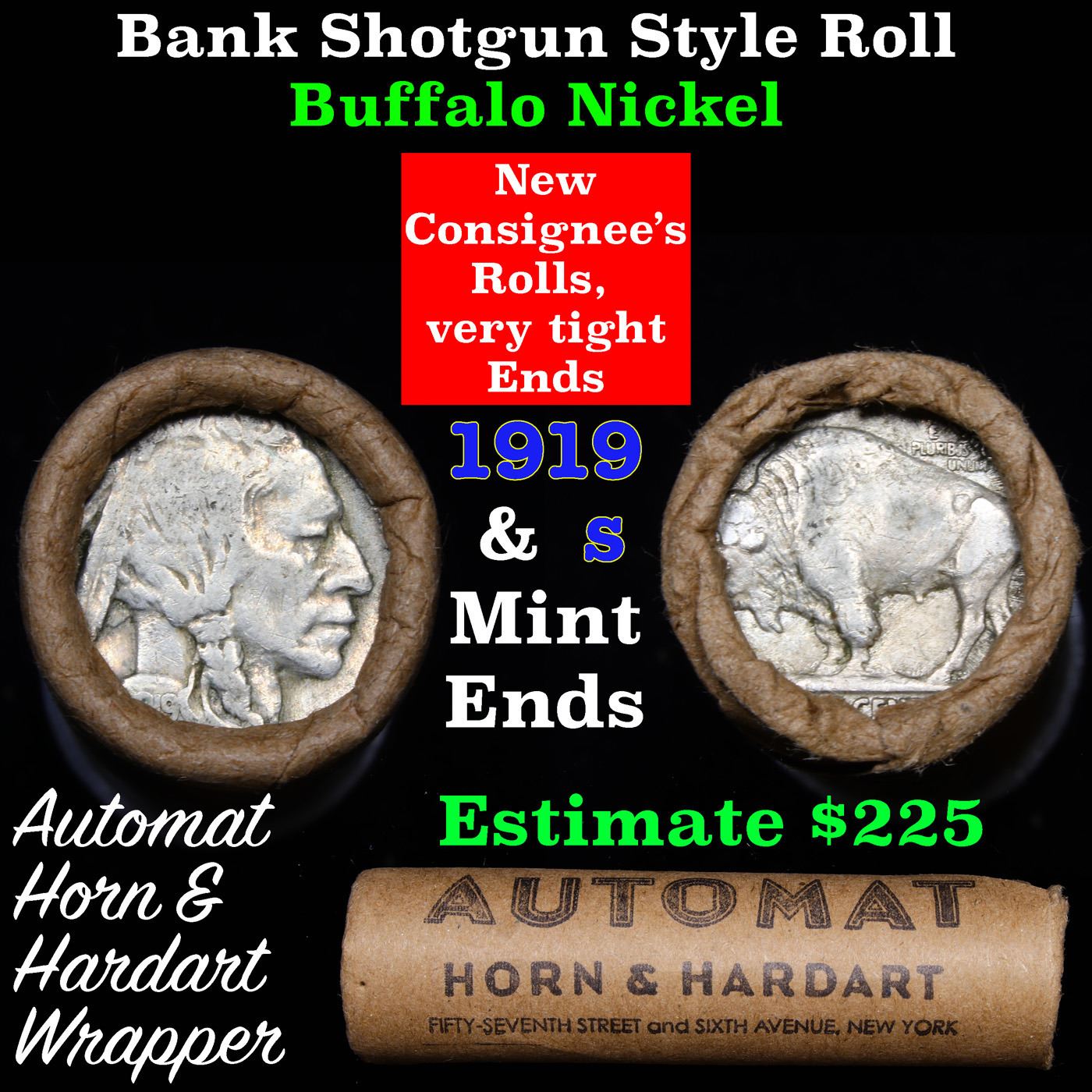 Buffalo Nickel Shotgun Roll in Old Bank Style 'Automat Horn & Hardart' Wrapper 1919 & s Mint Ends. The roll is held in an old, rare 'Automat Horn & Hardart' Bank style wrapper. They are all frrom one Estate. The ends on these rolls are very tight. We will guarantee they are all full dates.