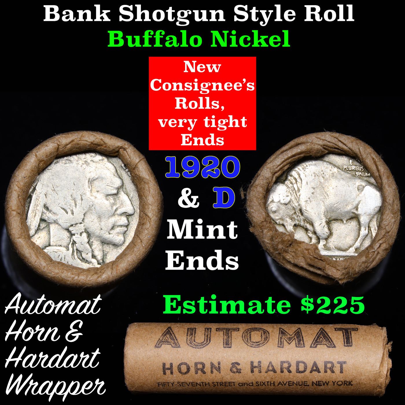 Buffalo Nickel Shotgun Roll in Old Bank Style 'Automat Horn & Hardart' Wrapper 1920 & d Mint Ends. The roll is held in an old, rare 'Automat Horn & Hardart' Bank style wrapper. They are all frrom one Estate. The ends on these rolls are very tight. We will guarantee they are all full dates.