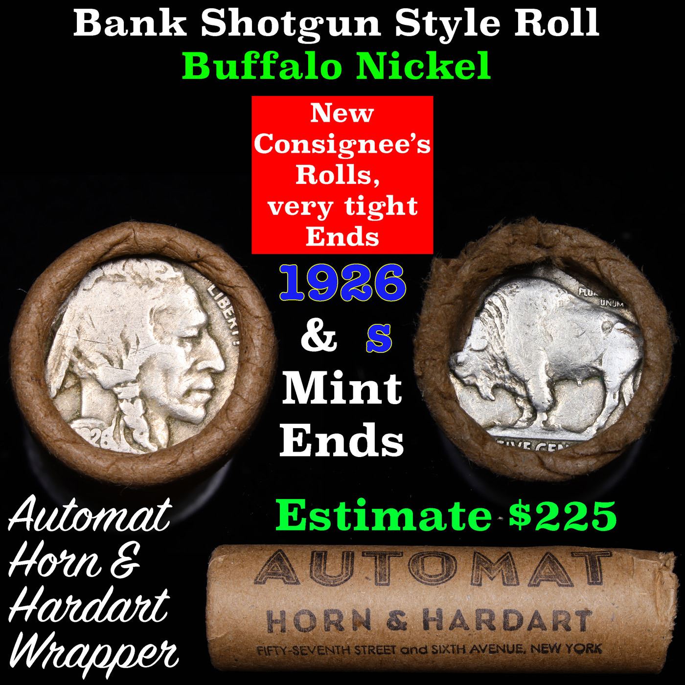 Buffalo Nickel Shotgun Roll in Old Bank Style 'Automat Horn & Hardart' Wrapper 1926 & s Mint Ends. The roll is held in an old, rare 'Automat Horn & Hardart' Bank style wrapper. They are all frrom one Estate. The ends on these rolls are very tight. We will guarantee they are all full dates.
