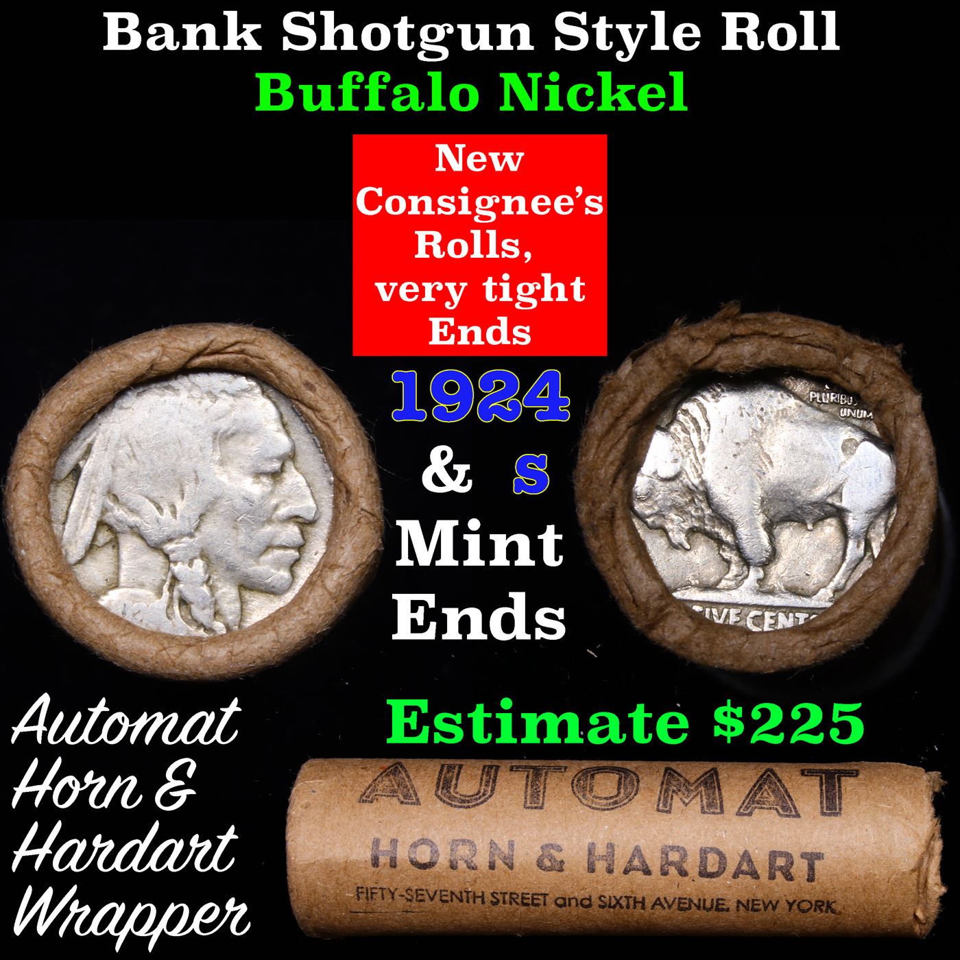 Buffalo Nickel Shotgun Roll in Old Bank Style 'Automat Horn & Hardhat' Wrapper 1924 & s Mint Ends. The roll is held in an old, rare 'Automat Horn & Hardhat' Bank style wrapper. They are all frrom one Estate. The ends on these rolls are very tight. We will guarantee they are all full dates.