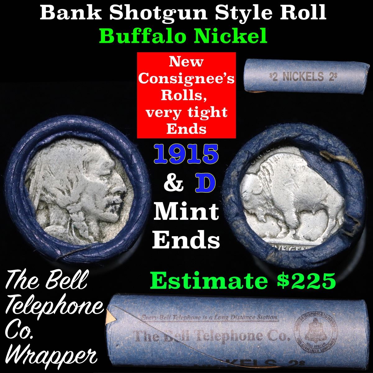 Buffalo Nickel Shotgun Roll in Old Bank Style 'Bell Telephone' Wrapper 1915 & d Mint Ends. The roll is held in an old, rare "Bell Telephone Co." Bank style wrapper. This is the Bell Telephone logo from the 1960's. They are all frrom one Estate. The ends on these rolls are very tight. We will guarantee they are all full dates.