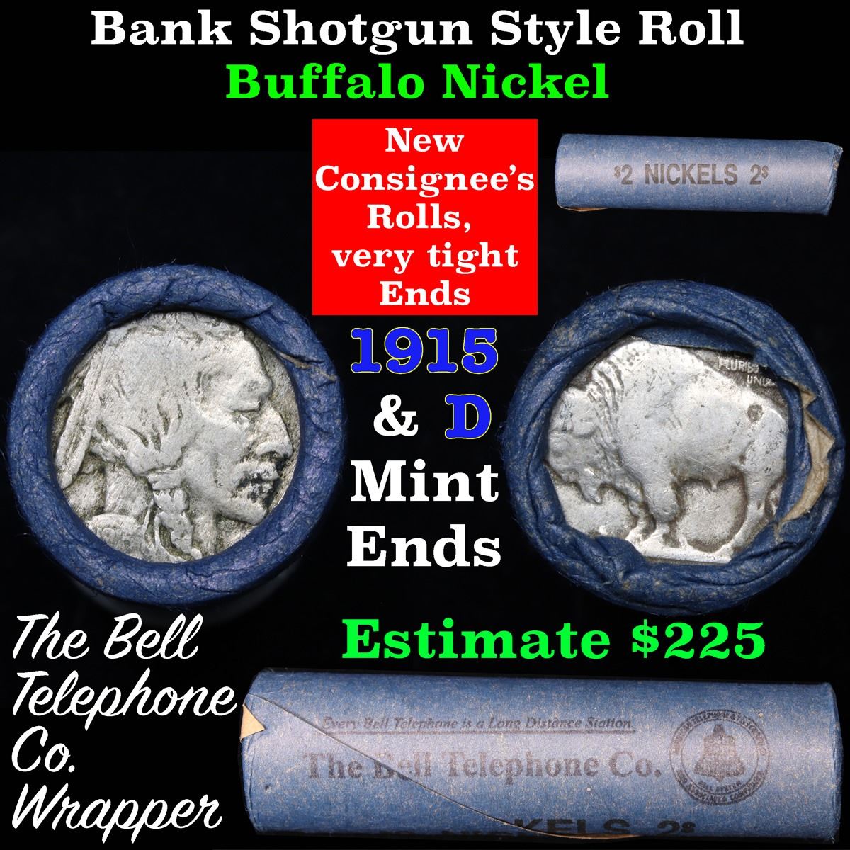 Buffalo Nickel Shotgun Roll in Old Bank Style 'Bell Telephone' Wrapper 1915 & d Mint Ends. The roll is held in an old, rare "Bell Telephone Co." Bank style wrapper. This is the Bell Telephone logo from the 1960's. They are all frrom one Estate. The ends on these rolls are very tight. We will guarantee they are all full dates.