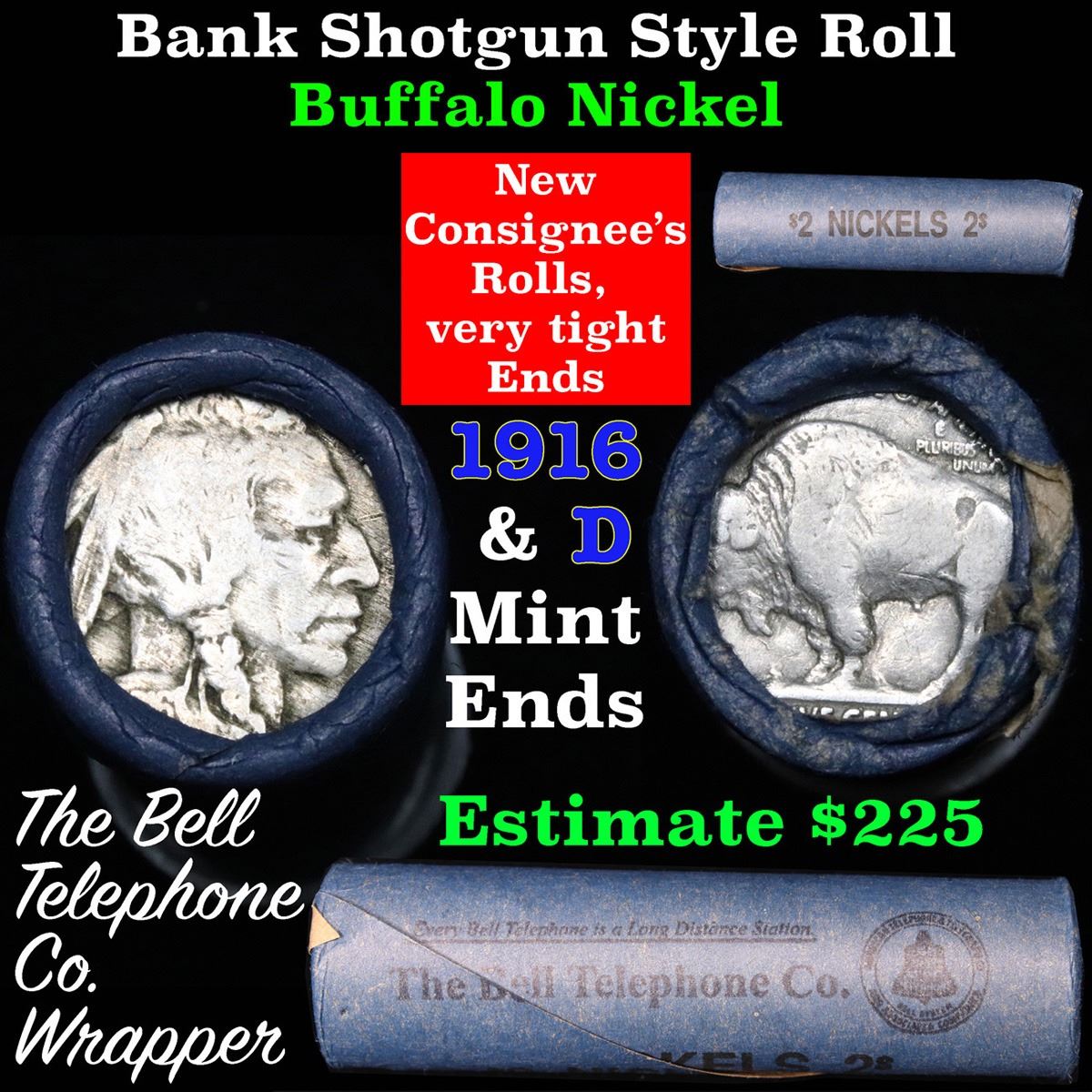 Buffalo Nickel Shotgun Roll in Old Bank Style 'Bell Telephone' Wrapper 1916 & d Mint Ends. The roll is held in an old, rare "Bell Telephone Co." Bank style wrapper. This is the Bell Telephone logo from the 1960's. They are all frrom one Estate. The ends on these rolls are very tight. We will guarantee they are all full dates.