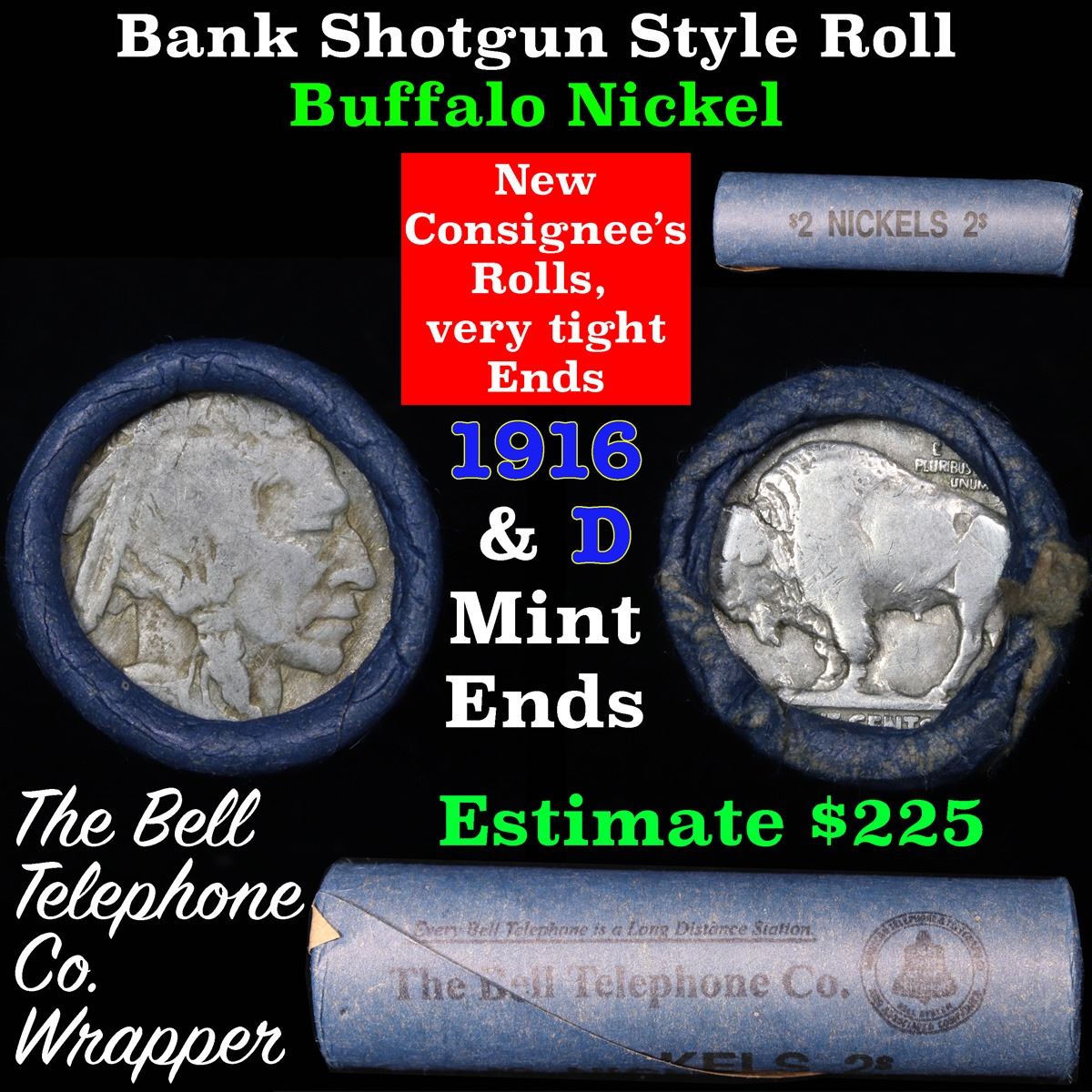 Buffalo Nickel Shotgun Roll in Old Bank Style 'Bell Telephone' Wrapper 1916& d Mint Ends. The roll is held in an old, rare "Bell Telephone Co." Bank style wrapper. This is the Bell Telephone logo from the 1960's. They are all frrom one Estate. The ends on these rolls are very tight. We will guarantee they are all full dates.
